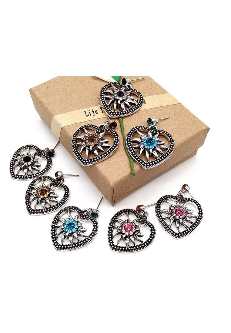 Mit diesen zauberhaften Ohrsteckern in Herzform mit Edelweiss-Motiv ziehst du alle Blicke auf dich. Die glitzernden hellblauen Steine verleihen den Ohrringen einen funkelnden Akzent, während das Edelweiss in der Mitte mit zusätzlichen Glitzersteinen deinen Look perfekt abrundet. Diese nickelfreien Modeschmuck-Ohrstecker, mit einer Breite von ca. 27mm und einer Höhe von ca. 37Mm (inklusive dem Stecker gemessen), sind die ideale Ergänzung zu deinem Dirndl oder deiner Lederhose. Ob für das Oktoberfest, eine Trachtenhochzeit oder ein anderes festliches Event – diese Ohrstecker passen zu jedem Anlass, an dem du dich trachtig zeigen möchtest. Sie unterstreichen nicht nur deinen traditionellen Stil, sondern sorgen auch für einen glamourösen Auftritt. Kombiniere sie mit einer passenden Trachtenkette und runde dein Outfit stilvoll ab. Du kannst diese wunderschönen Ohrstecker direkt im Laden in Wallisellen kaufen oder bequem online bestellen. Dank des Schweizer Versandlagers geniesst du schnellen und kostenlosen Versand direkt zu dir nach Hause. Gönen dir diesen funkelnden Trachtenschmuck und strahle bei jedem Anlass!