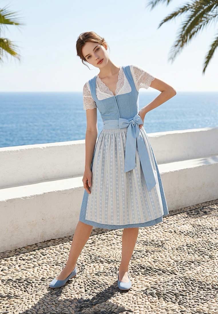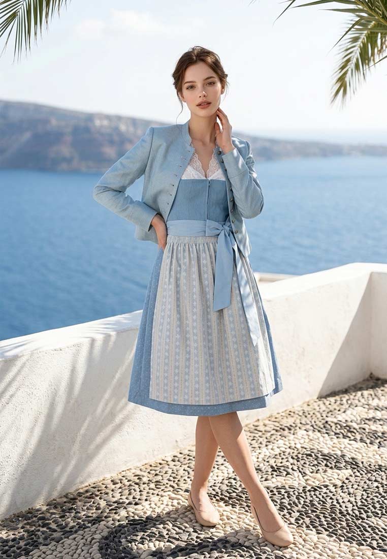 Das Dirndl Dajana in der Farbe eisblau von der Marke Kaiseralm in 70cm Rocklänge ist ein elegantes und traditionelles Trachtenkleid. Das Design zeichnet sich durch einen mittig platzierten Reissverschluss ohne Schnürung aus, der das An- und Ausziehen erleichtert. Das Dirndl verfügt zudem über eine kleine Tasche im Dirndlrock, jedoch gut versteckt unter der Schürze, ideal um kleine Accessoires oder persönliche Gegenstände mitzuführen. Hinsichtlich der Materialien setzt die Firma Auzinger vorwiegend auf hochwertige Leinen- und Baumwollstoffe. Diese perfekte Materialwahl sorgt nicht nur für ein angenehmes Tragegefühl, sondern unterstreicht auch die Qualität und Authentizität des Dirndls. Leinen ist bekannt für seine Atmungsaktivität und Strapazierfähigkeit, während Baumwolle für ihre Weichheit und Hautfreundlichkeit geschätzt wird. Das Dirndl wird ohne Dirndlbluse geliefert. Eine passende Bluse und eine passende Trachtenjacke sowie viele verschiedene Accessoires findest du bestimmt in unserem Shop. Tipp: Wir empfehlen bei diesem hochwertigen Kleid den Gang zur Reinigung, um die Materialien des Kleides nicht zu beschädigen.