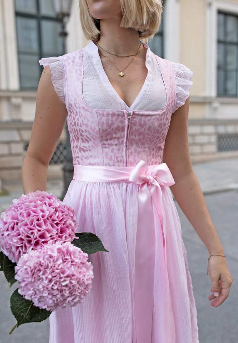 Entdecke das bezaubernde Dirndl von MarJo Trachten in zartem Puderrosa, das mit seiner romantischen Ausstrahlung perfekt für das Oktoberfest ist. Das gesamte Kleid, inklusive des Oberteils, ist in einem sanften Puderrosa gehalten, wobei das Oberteil mit einem Ton-in-Ton Leo-Print versehen ist. Diese dezente, aber raffinierte Kombination verleiht dem Dirndl eine besondere Eleganz. Das Kleid hat eine etwas kürzere Rocklänge von 65 cm, was es besonders modern und jugendlich macht. Dazu kommt eine luftige, leichte Schürze aus zartem Puderrosa Stoff, die den Look wunderbar abrundet und für eine feminine Note sorgt. In unserem Shop findest du auch eine passende Bluse in demselben Puderrosa, die dein Oktoberfest-Outfit perfekt ergänzt und ihm den letzten Schliff verleiht. Dieses Animal Print Dirndl ist ideal für alle, die in einem stilvollen und romantischen Kleid das Oktoberfest geniessen möchten. Beachte bitte, dass die Bluse nicht im Preis enthalten ist, aber in unserem Sortiment erhältlich ist. Sichere dir dieses zauberhafte Leo Look Dirndl in zartem Puderrosa, solange es noch verfügbar ist, und mach dich bereit für einen unvergesslichen Auftritt!