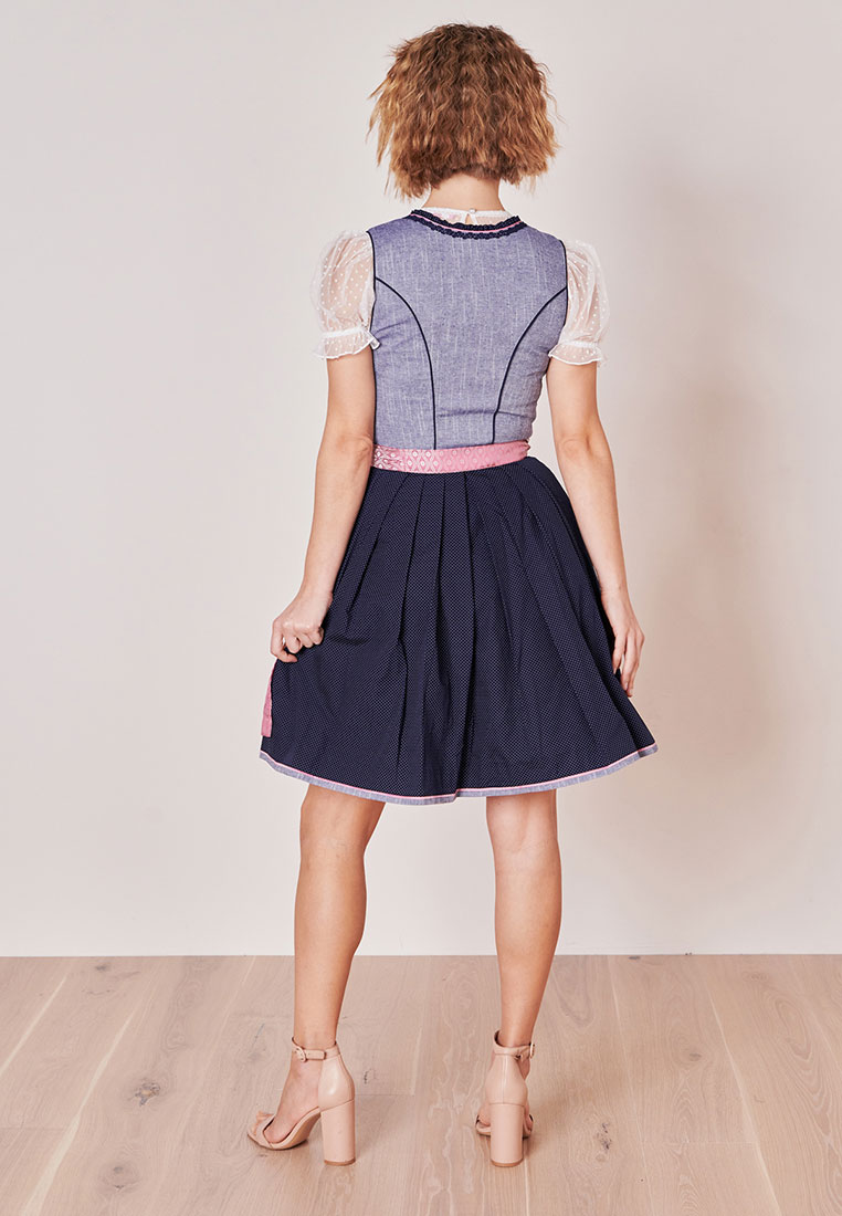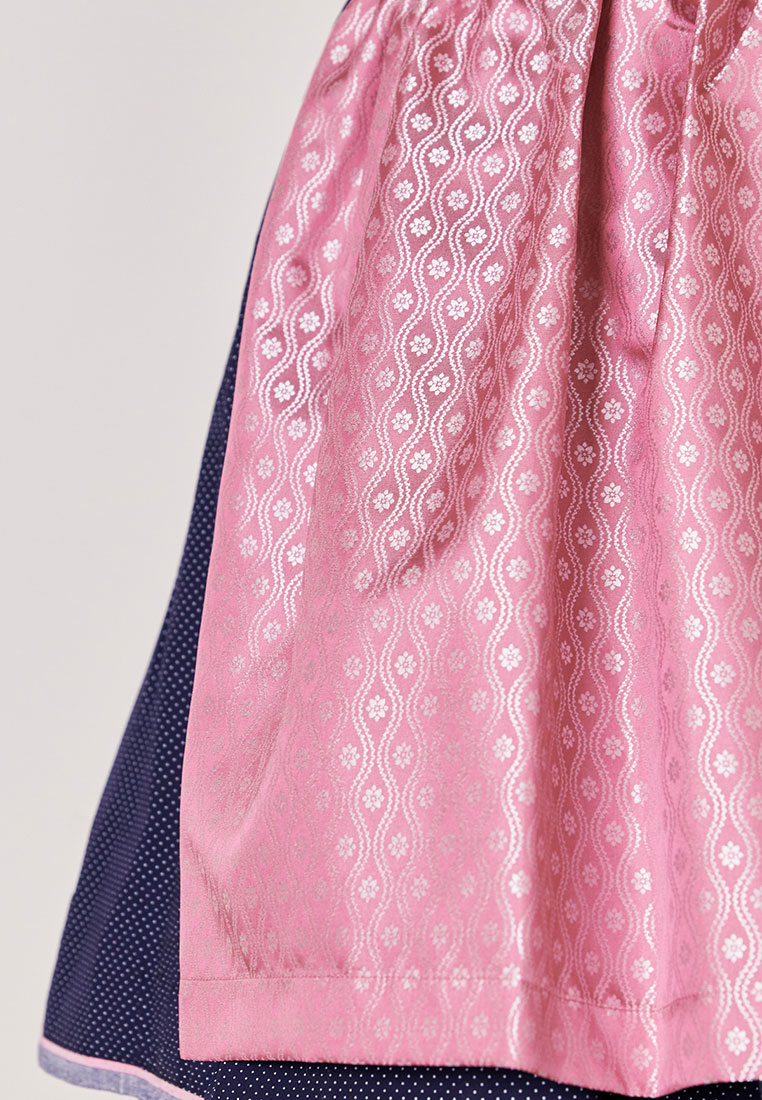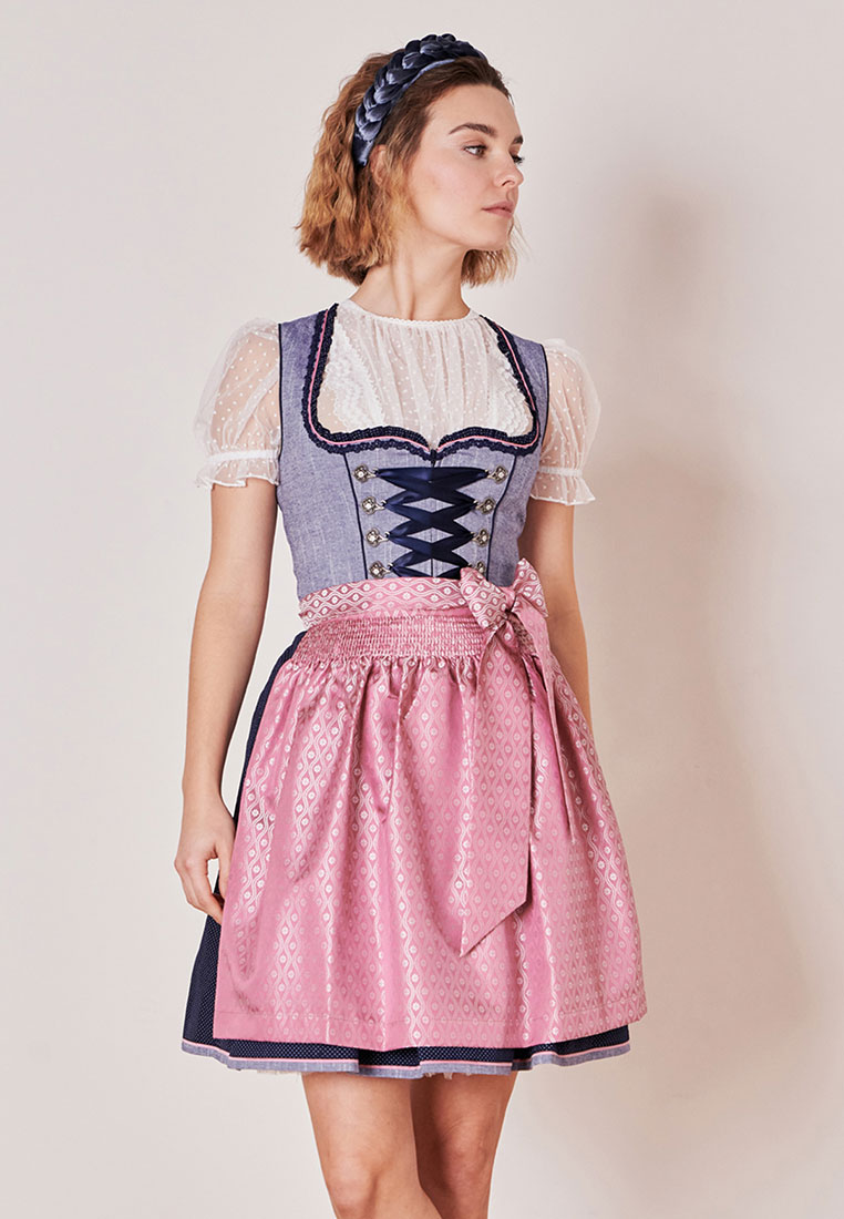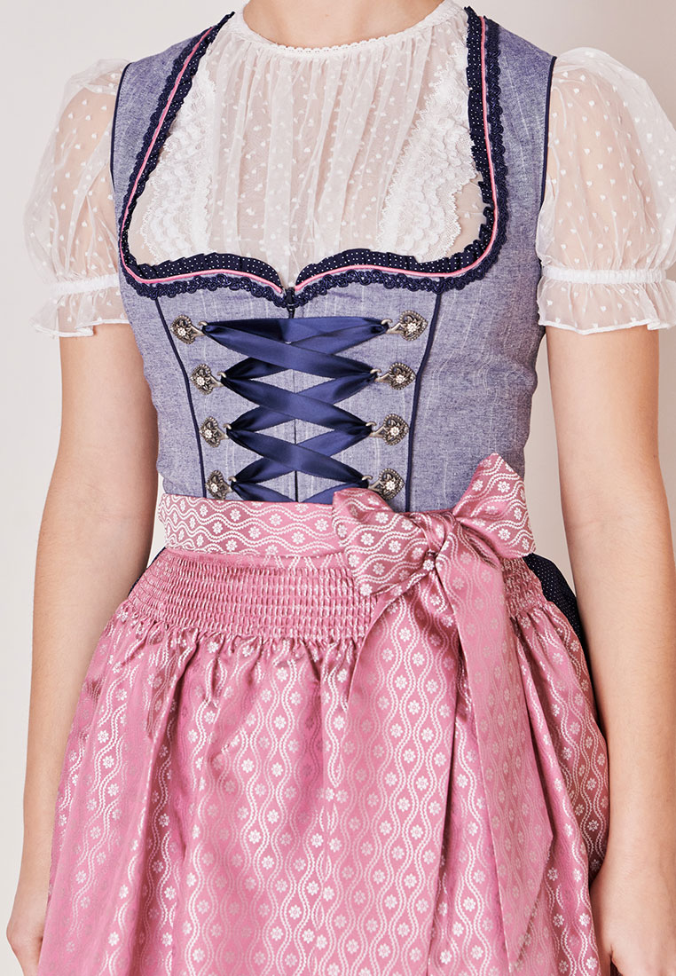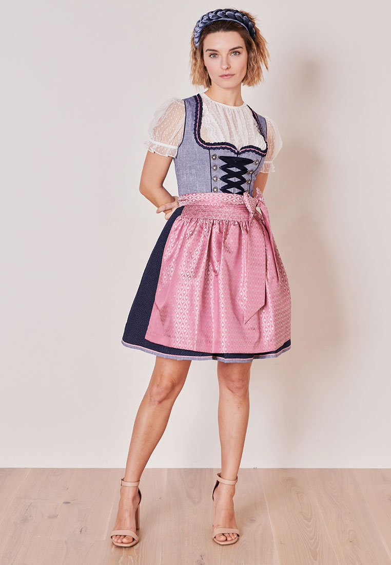 Zauberhaft aber doch stilvoll präsentiert sich das moderne Dirndl Skylar von Krüger. Das Mieder mit Herz-Ausschnitt und Miederschnürung betont gekonnt deine Taille und setzt sie super in Szene. Die kurzen Ärmel sorgen für eine sommerliche Leichtigkeit. Für einfaches An- und Ausziehen sorgt der Reißverschluss vorne. Der 60cm lange Rock ist knielang mit schlichtem Mustern und verleiht dem Dirndl einen traditionellen Touch. Praktisch sind auch die zwei Eingrifftaschen im Rock, hübsch versteckt unter der Schürze, die genug Platz für deine wichtigsten Essentials bieten. Abgerundet wird das stimmige Bild durch die rosa Schürze. Mit dem Dirndl Skylar bist du für jedes Fest bestens gerüstet. Das Trachtendirndl wird ohne passende Bluse geliefert. Eine solche Drindlbluse findest du in unserem Laden oder im Onlineshop.