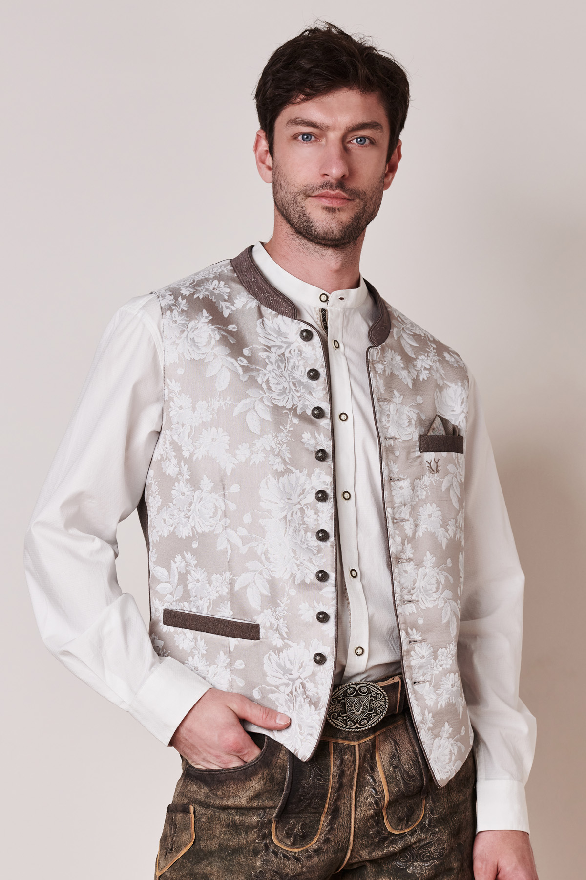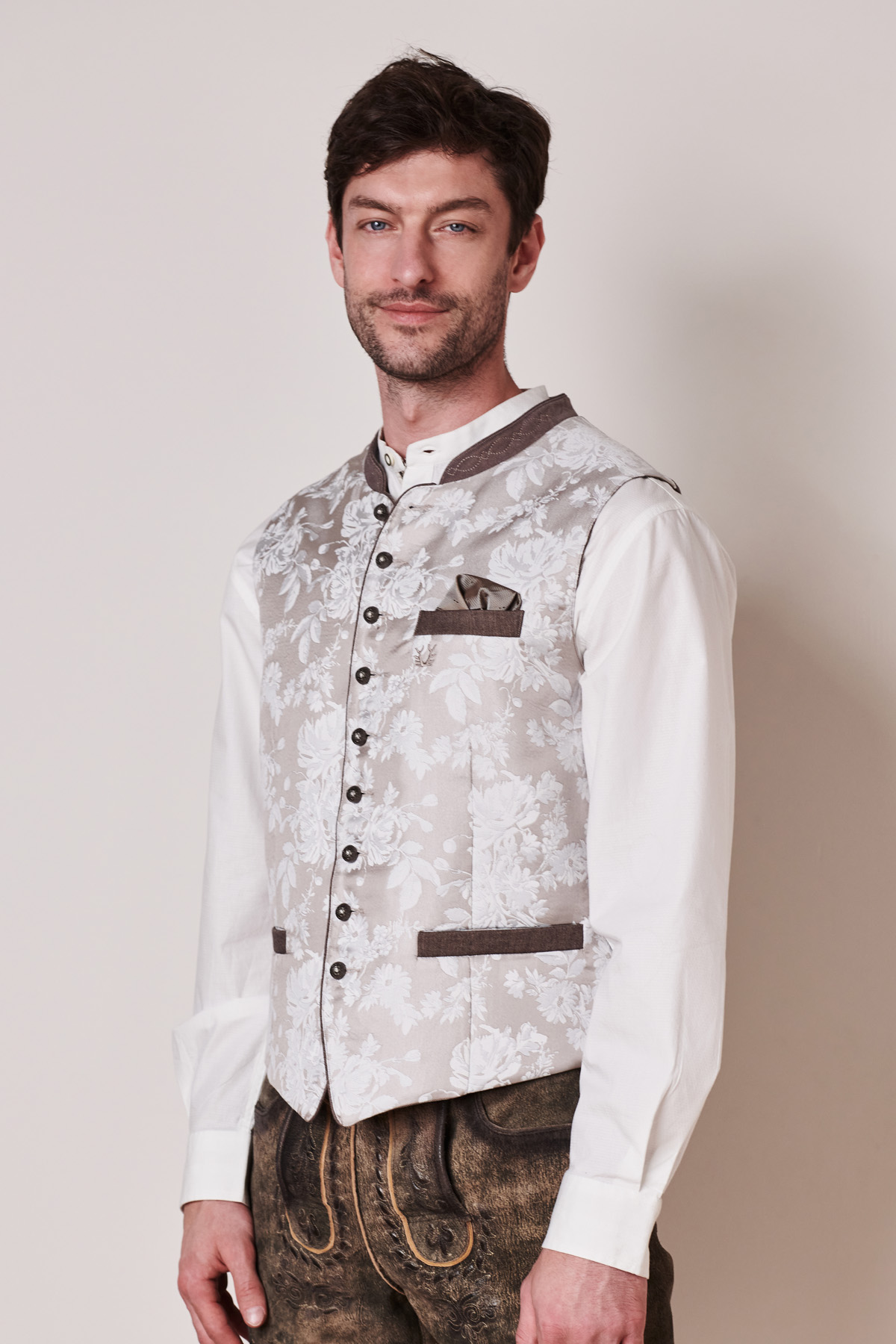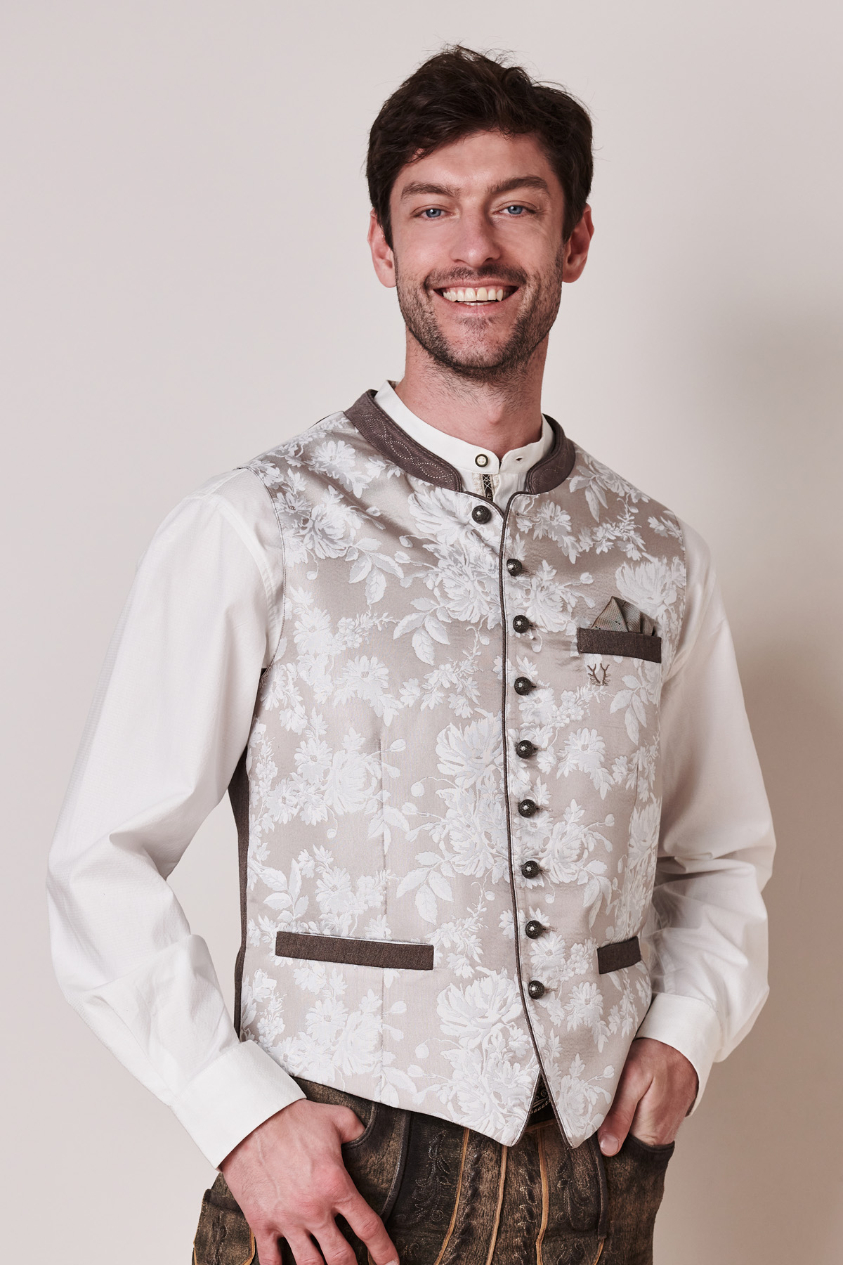 Die Weste Gais in Silber von Maddox verbindet traditionelle Elemente mit einem edlen, modernen Design. Der feine Jacquardstoff mit dezenter Musterung sorgt für eine stilvolle, luxuriöse Optik, während die dezenten Kontrastpaspeln in Grau an den Taschen das elegante Gesamtbild abrunden. Der hochgeschlossene Stehkragen aus dunklem Kontraststoff verleiht der Weste eine klassische Note und betont den traditionellen Trachtenstil. Die antiksilbernen Knöpfe mit feiner Gravur unterstreichen den hochwertigen Charakter und setzen stilvolle Akzente. Ein weiteres Highlight ist die hochwertige Rückseite aus feinem Stoff, die für optimalen Tragekomfort sorgt. Durch den verstellbaren Riegel lässt sich die Passform individuell anpassen. Egal, ob traditionell mit Lederhose oder stilvoll mit Stoffhose kombiniert – die Trachtenweste Gais verleiht jedem Outfit eine elegante Note. Sie ist der ideale Begleiter für das Oktoberfest, Hochzeiten und festliche Anlässe. Dank ihres edlen Designs und der hochwertigen Verarbeitung ist sie ein zeitloses Essential für modebewusste Herren.