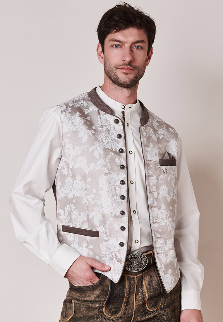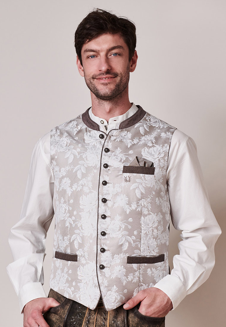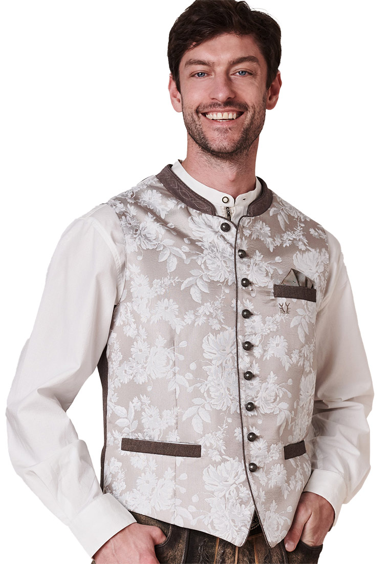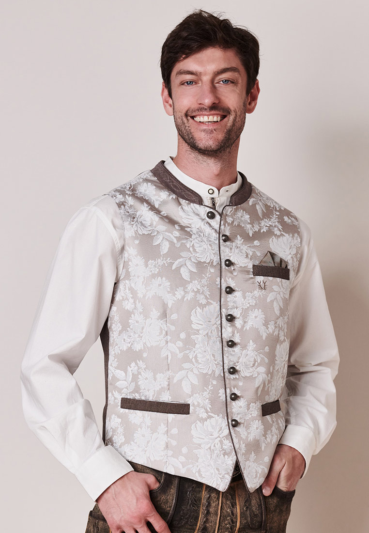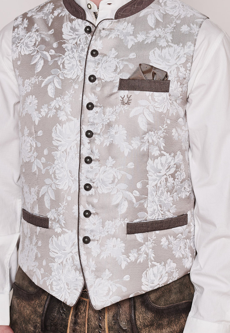 Trachtenweste Anselmo von Stockerpoint in taupe. Die hochwertige Weste ist aus einem hochwertigen Jacquard Stoff in Seidenoptik gefertigt. Die gerade Schnittführung garantiert eine sehr gute Passform und einen angenehmen Tragekomfort. Der klassische Stehkragen, die Taschen und die Knopfleiste sind mit einem farblich abgestimmten Paspel gefertigt und unterstreichen das exklusive Design. Trachtige Knöpfe in altsilber setzen sich gekonnt in Szene. Die Weste ist der ideale Kombipartner zu unseren Lederhosen und runden den Trachtenlook perfekt ab.
