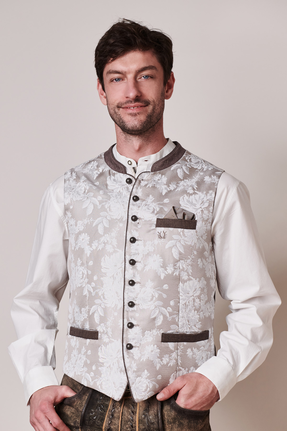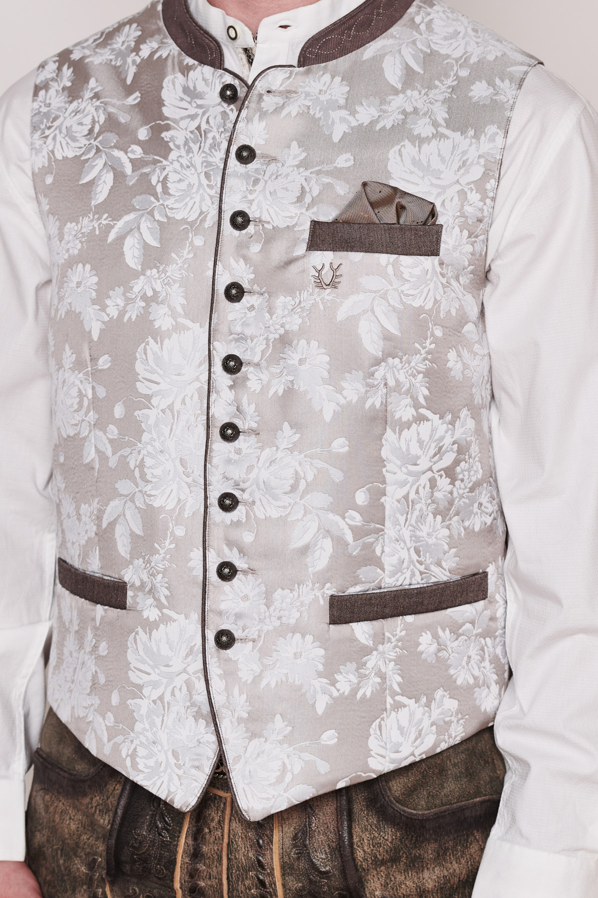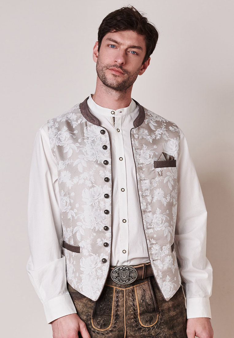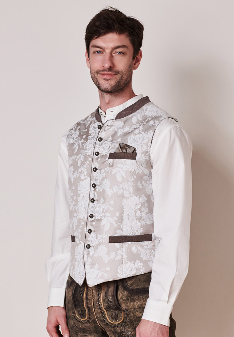 Trachtenweste Anselmo von Stockerpoint in taupe. Die hochwertige Weste ist aus einem hochwertigen Jacquard Stoff in Seidenoptik gefertigt. Die gerade Schnittführung garantiert eine sehr gute Passform und einen angenehmen Tragekomfort. Der klassische Stehkragen, die Taschen und die Knopfleiste sind mit einem farblich abgestimmten Paspel gefertigt und unterstreichen das exklusive Design. Trachtige Knöpfe in altsilber setzen sich gekonnt in Szene. Die Weste ist der ideale Kombipartner zu unseren Lederhosen und runden den Trachtenlook perfekt ab.