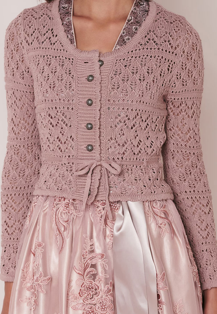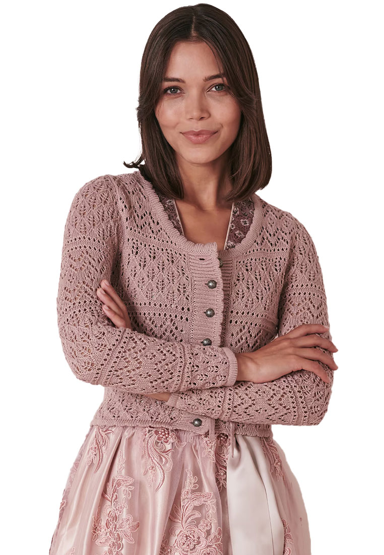 Die Trachtenstrickjacke von Krüger ist das perfekte Accessoire, um Ihr Dirndl-Outfit abzurunden. Die Jacke ist in einer klassischen Häkeloptik gestaltet und besteht aus hochwertigen Materialien, die eine lange Lebensdauer und angenehmen Tragekomfort gewährleisten. Die Strickjacke ist in einem dezenten Roseton gehalten, welcher sich sehr gut zu jedem Dirndl kombinieren lässt. Die silbernen kleinen runden Knöpfe an der Vorderseite verleihen der Jacke eine elegante Note und runden das Gesamtbild ab. Die Jacke ist perfekt für kältere Tage auf dem Oktoberfest oder anderen Trachtenveranstaltungen geeignet und kann leicht über einem Dirndl getragen werden. Die Jacke ist in verschiedenen Größen erhältlich und kann somit individuell angepasst werden, um einen optimalen Tragekomfort zu gewährleisten. Mit dieser Trachtenstrickjacke von Krüger können Sie sicher sein, dass Sie ein hochwertiges und stilvolles Kleidungsstück erwerben, das Ihr Dirndl-Outfit perfekt ergänzt.