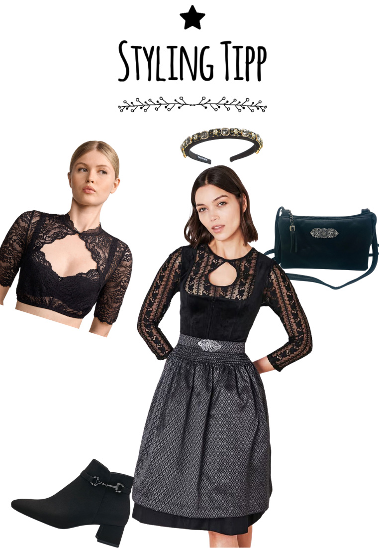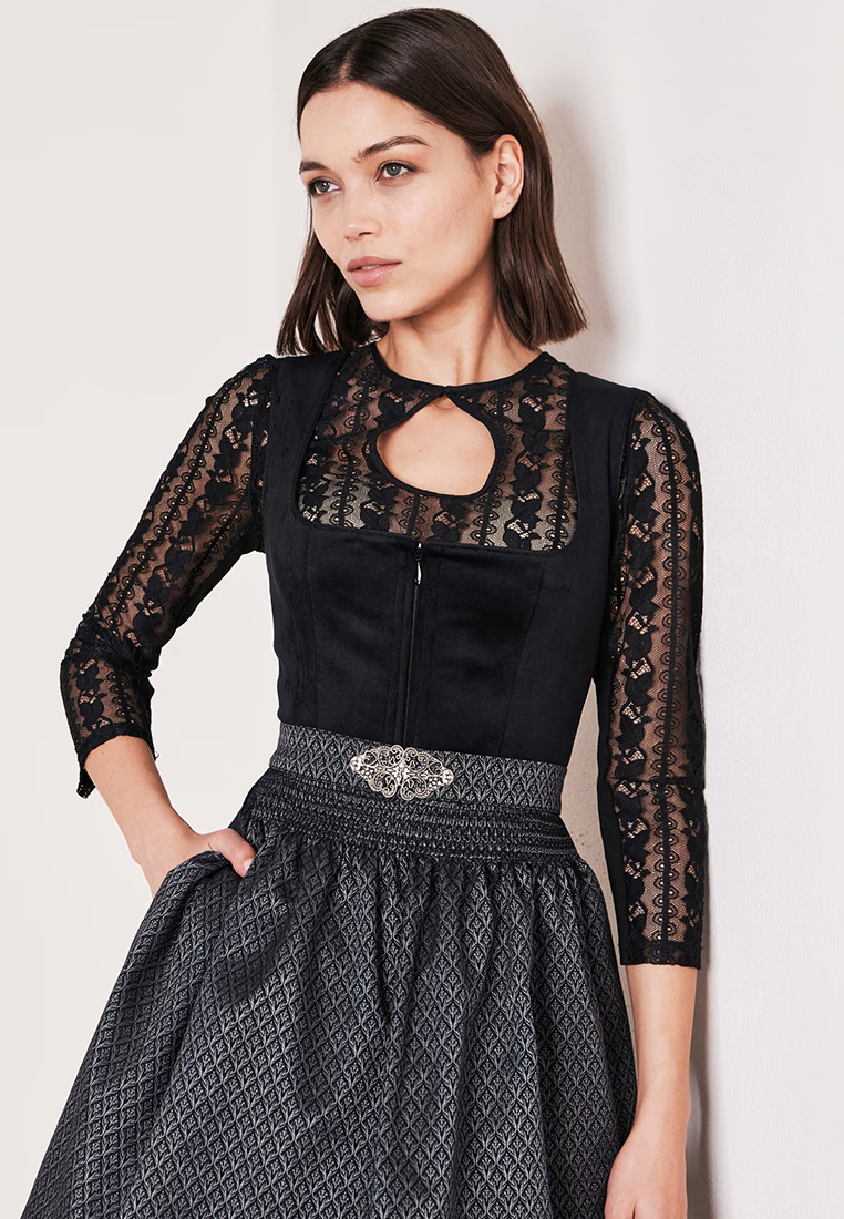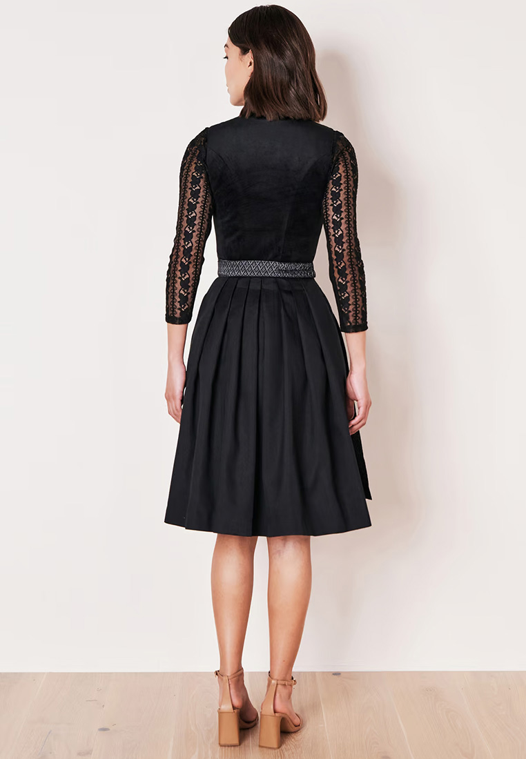 Das edle Samtdirndl Alisha von Krüger in Schwarz vereint klassischen Charme mit stilvollen Details. Das unifarbene Mieder aus weichem Samt und der gerade Ausschnitt setzen das Dekolleté elegant in Szene. Ein besonderes Highlight ist die filigran gemusterte Schürze, die mit einer dekorativen Schnalle verziert ist. Der knielange Rock mit einer Länge von 60 cm sorgt für eine feminine Silhouette. Ein praktischer Reißverschluss auf der Vorderseite erleichtert das An- und Ausziehen. Das Dirndl Alisha ist die ideale Wahl für alle, die Tradition mit Eleganz verbinden möchten.