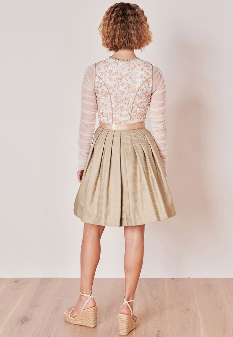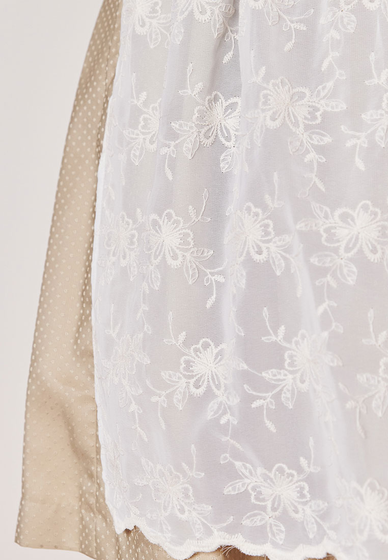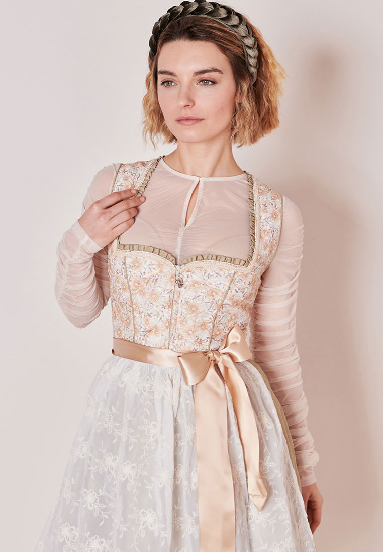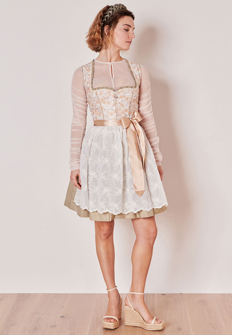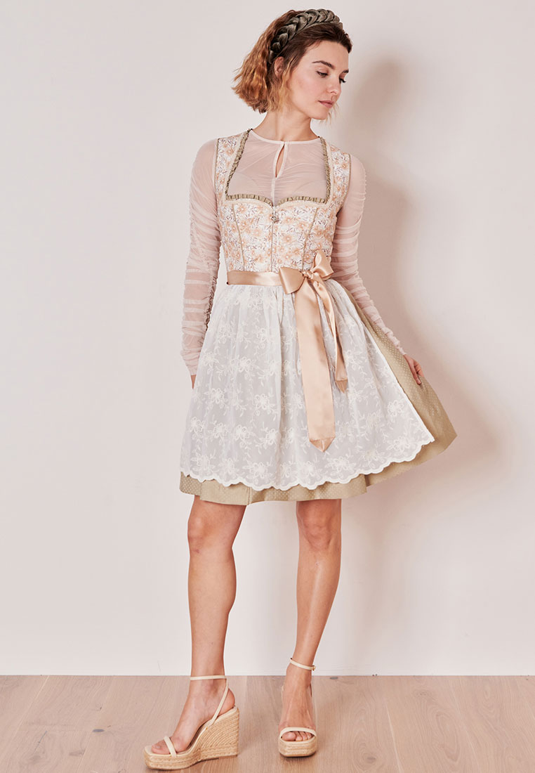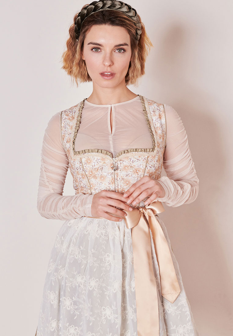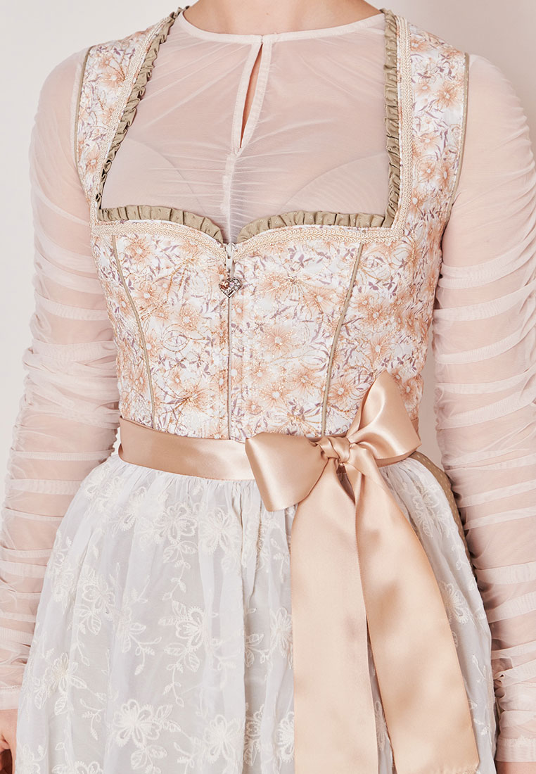 Dirndl Evianne von Stockerpoint/Bergfeuer in taupe. Das stilvolle Dirndl begeistert durch das exklusive Jacquard Muster und ist mit liebevollen Details versehen. Für die feminine Note sorgen die eingearbeiteten Rüschen, die aufgenähten Zierborten sowie die mit Strasssteinen verzierten Miederhaken. Die Schnürung aus zwei verschieden farbigen Satinbändern unterstreicht die feminine Note. Durch die filigrane, farblich abgestimmte und unterlegte Spitzenschürze entsteht der besondere Look. Die Rocklänge beträgt 55cm. Eine passende Dirndlbluse findest du bestimmt in unserem Sortiment.