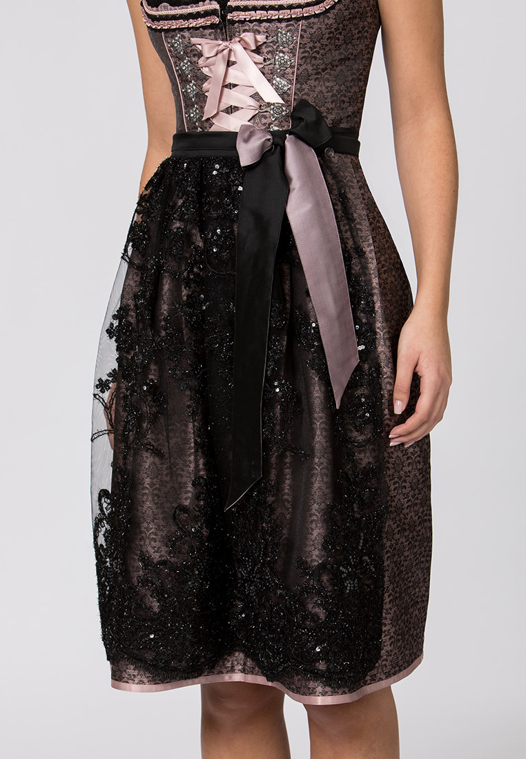 Dirndl Finja für Damen von Wiesnwuid in altrosa. Das edle Dirndl begeistert durch das trendige Jacquard Muster und der passenden Spitzenschürze. Für die feminine Note sorgen die eingearbeiteten Rüschen am Rundausschnitt, die aufgenähten Zierborten sowie die verzierten Miederhaken in altsilber. Durch das zweifarbige Schürzenband entsteht der besondere Look. Die Schnürung aus einem passenden Satinband unterstreicht das edle Design. Ein absolutes Highlight für jede Dirndlträgerin. Rocklänge 65cm. Eine passende Bluse ist in unserem Sortiment zu finden. Das Set umfasst lediglich Kleid und Schürze.