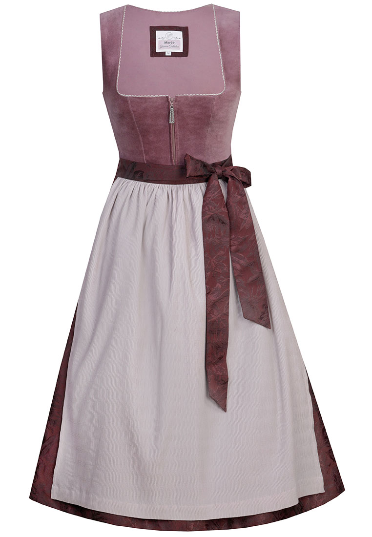Entdecke die subtile Schönheit des Dirndl Irsee Traube Mauve mit einer Rocklänge von 70 cm. Dieses einzigartige Dirndl von Marjo Trachten präsentiert eine harmonische Farbkombination in Mauve. Mauve ist die Bezeichnung für einen Farbton, der zwischen Violett, Grau und Pink changiert und einen Hauch von Raffinesse verleiht. Die Schürze ist in einem passenden hellen Rosé gehalten, während die Schleife eine Nuance dunkler ist, was einen ansprechenden Kontrast ergibt und dem Outfit eine elegante Note verleiht. Das Kleid verfügt über einen mittigen Reissverschluss auf der Vorderseite, der mit einem dekorativen Anhänger verziert ist und für müheloses An- und Ausziehen sorgt. Die Umrandung um das Dekolleté ist bewusst schlicht und dezent gehalten, da der Dirndltrend für das Jahr 2024 in eine schlichte und minimalistische Richtung geht - ganz nach dem Motto "Weniger ist mehr". Deswegen sind auch Dirndls mit schlichtem Reissverschluss trendiger, wie Dirndl mit Schnürungen. Auch wenn eine Schnürung natürlich immer geht und auch in Zukunft immer Ihren Platz in der Trachtenmode behalten wird. Im Preis enthalten sind das Kleid und die Schürze. Dirndlblusen findest du separat in unserem Shop, um dein Outfit individuell zu gestalten und deinen persönlichen Stil zu unterstreichen. Das Dirndl Irsee Traube Mauve ist ein Statement für Eleganz und Stil und eignet sich perfekt für eine Vielzahl von Anlässen, von traditionellen Festen bis hin zu gesellschaftlichen Veranstaltungen. Trage es mit Stolz auf dem Oktoberfest und geniesse die zeitlose Schönheit dieses wunderschönen Dirndls von Marjo Trachten! Passende Accessoires wie Trachtenketten und Trachtentaschen oder den perfekten Trachtenschuh, findest du ebenfalls in unserem Onlineshop, wie auch in unserem Fachgeschäft in Wallisellen.