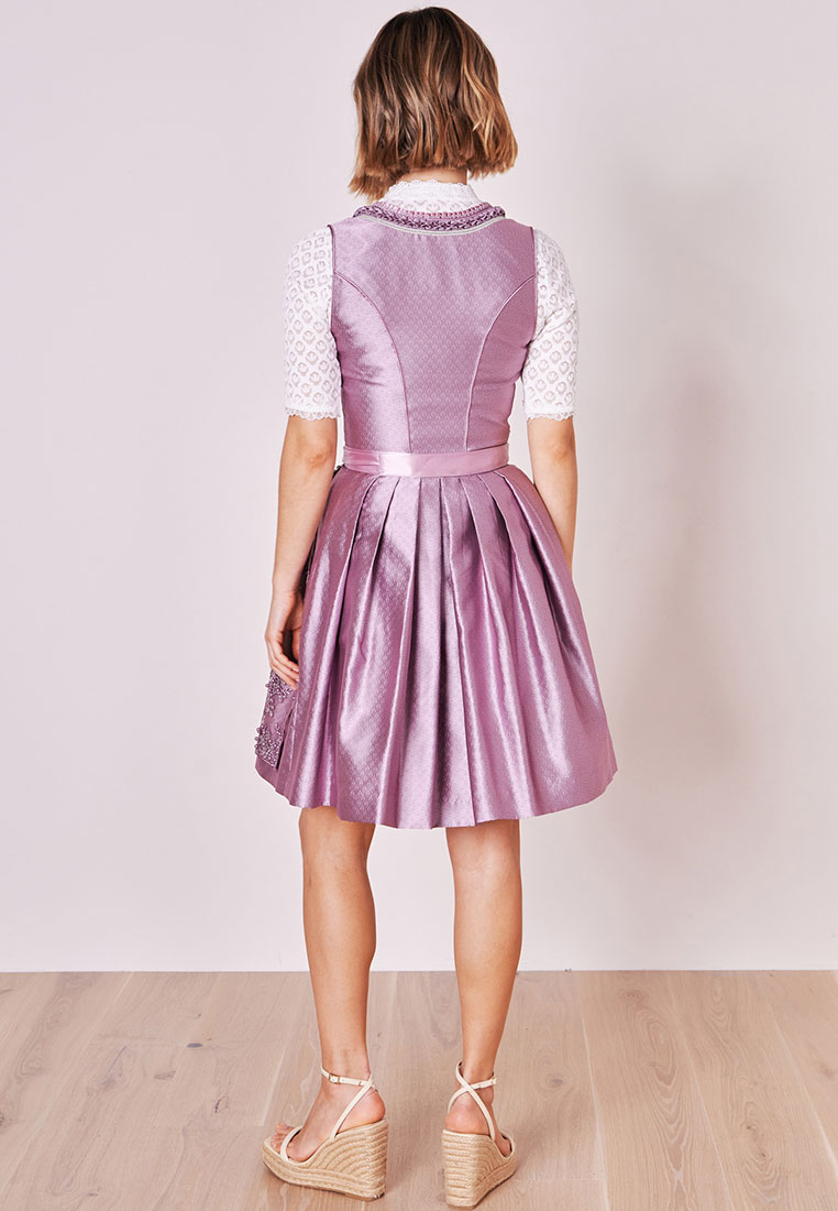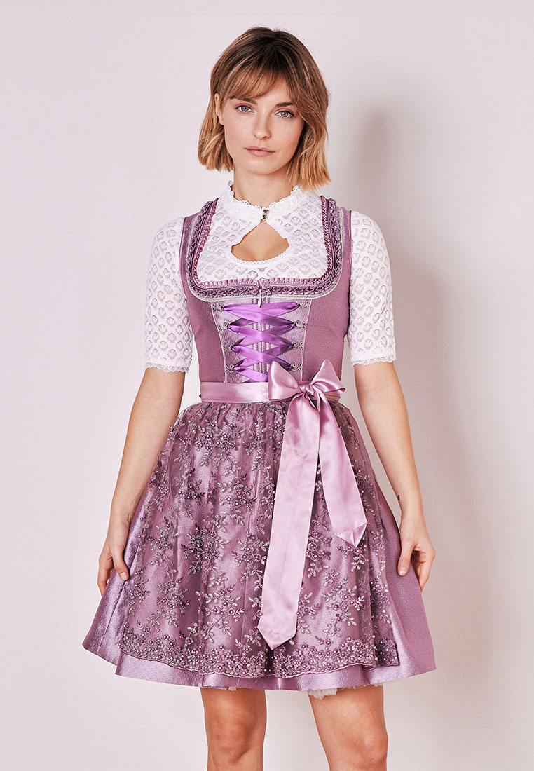Kalila, dass Dirndl von Krüger für moderne Prinzessinen in traumhaftem Lila. Das Muster ist ein elegantes Ornament, das sowohl dem Mieder als auch dem Rock einen zauberhaften Look verleiht. Ein besonderes Highlight ist die prächtig bestickte Perlenschürze, die das Outfit perfekt abrundet. Mit dem geradlinigen Ausschnitt und der Miederschnürung wird das traditionelle Design liebevoll unterstrichen. Mit diesem Dirndl bist du bestens für das Oktoberfest eingekleidet. Natürlich kannst du dieses Trachtenkleid auch auf jedem traditionellen Fest wunderbar präsentieren. Dieses Trachtendirndl hat eine Rocklänge von 50cm und wird ohne Bluse geliefert. Eine passende Dirndlbluse findest du in unserem Online-Sortiment oder vor Ort in unserem Laden.