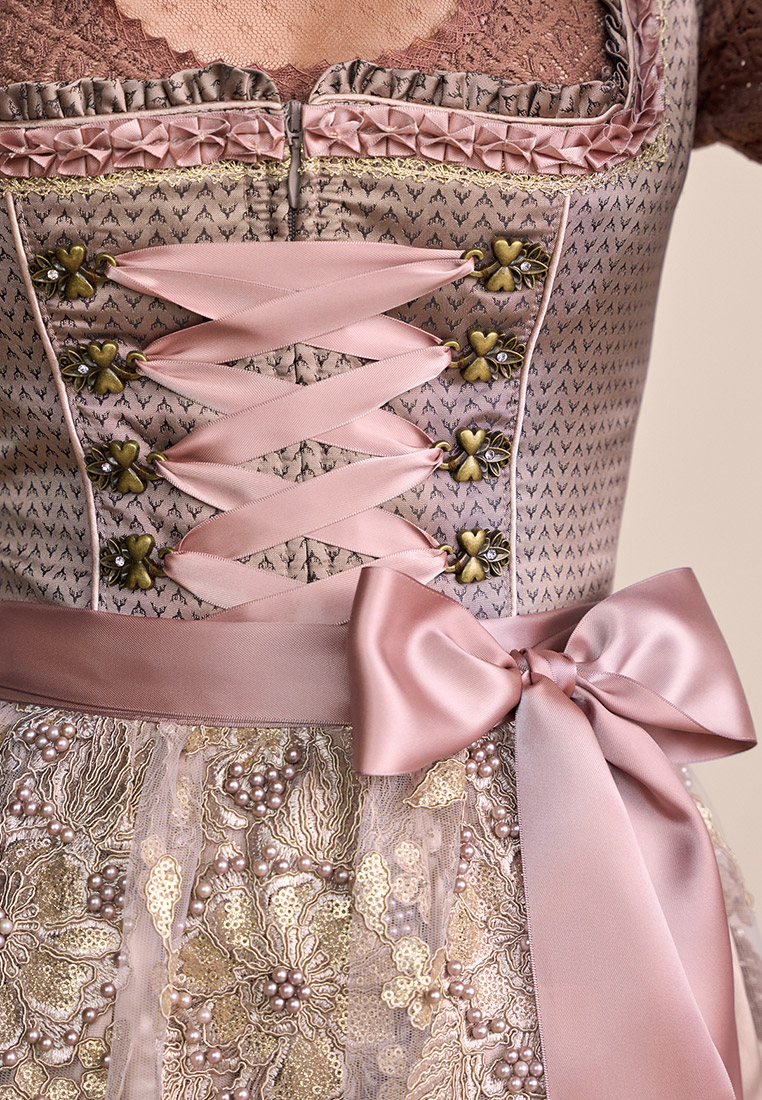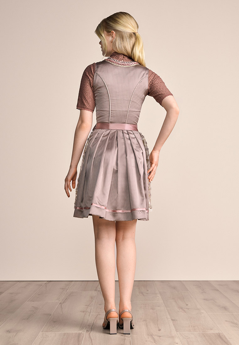 Willkommen in der zauberhaften Welt der Trachtenmode! Dieses bezaubernde Krüger Dirndl vereint harmonisch einen schönen Braunton mit zarten Altrosa-Verzierungen und Bändern zu einem wahrhaft atemberaubenden Ensemble. Die Rocklänge von 50 Zentimetern verleiht dem Mini Dirndl eine moderne Note, während die altrosa Verzierungen und Bänder sowie die beigefarbene Spitzenschürze mit altrosa runden Perlen das Outfit zu einem echten Blickfang machen. Ein besonderes Highlight ist die Froschmaulrüsche um das Dekolleté, die dem Dirndl eine verspielte Eleganz verleiht. Die aufwändige Verzierung rund um den Ausschnitt setzt somit tolle Akzente und betont die feminine Silhouette. Die Schnürung über dem eingearbeiteten Reissverschluss auf der Vorderseite sorgt nicht nur für eine perfekte Passform, sondern auch für eine raffinierte Optik. Die schönen Miederhaken sind mit funkelnden Glitzersteinen verziert, die dem Dirndl einen Hauch von Glamour verleihen. Dieses harmonische Kleid stammt aus dem Hause Krüger und ist ein echtes Must-Have für alle Liebhaber traditioneller Trachtenmode. Der Setpreis umfasst sowohl das Kleid als auch die Schürze, während passende Trachtenblusen separat in unserem Sortiment erhältlich sind. Liebe Kundin, liebe Kunde, um dein Outfit perfekt abzurunden, empfehlen wir dir passende Trachtenaccessoires wie eine Trachtentasche, Trachtenhaarschmuck und Trachtenschuhe. Lass dich von unserer Auswahl inspirieren und kreiere deinen ganz persönlichen Trachten-Look! Bestelle hier und wir versenden ab Schweizer Versandlager direkt zu dir nach Hause oder besuche unseren Trachtenladen in Wallisellen und lasse dich von einer riesigen Auswahl an Krüger Dirndl und anderen tollen Trachtenbrands verzaubern.