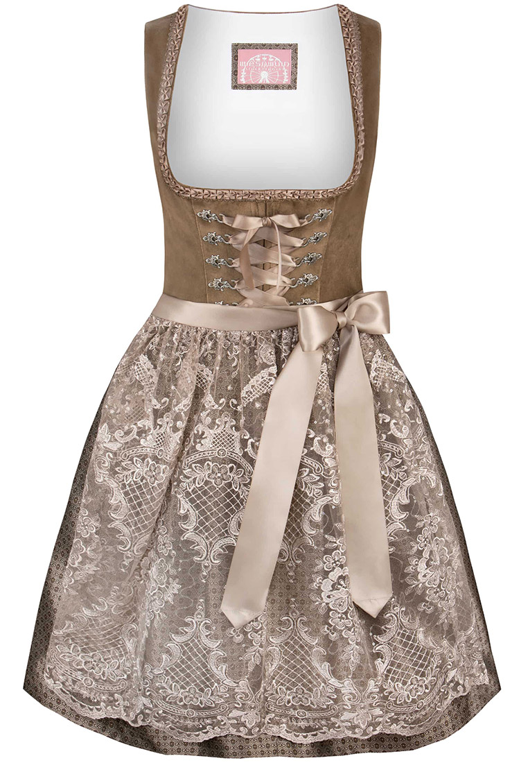 Dirndl Loredana von Wiesnwuid überzeugt durch sein ausdrucksstarkes Design in harmonischem Taupe, Ton in Ton mit exklusivem, hochwertigem Samt und liebevollen Details. Der gerade Ausschnitt zaubert ein schönes Dekolleté. Für den perfekten Auftritt sorgt das aufwendig gearbeitet Froschmaul mit Zierborte sowie die trachtigen Miederhaken. Die Schnürung mit den kontrastfarbigen Satinbändern unterstreicht den femininen Look. Die hochwertige, farblich abgestimmte Spitzenschürze rundet das Gesamtbild gekonnt ab. Die Rocklänge misst 55cm und eine Bluse ist nicht im Preis inklusive. Du findest jedoch viele tolle Dirndlblusen in unserem Sortiment. Trage dieses tolle Dirndl der Marke Stockerpoint zur Wiesn oder einen trachtigen Schlagerevent.