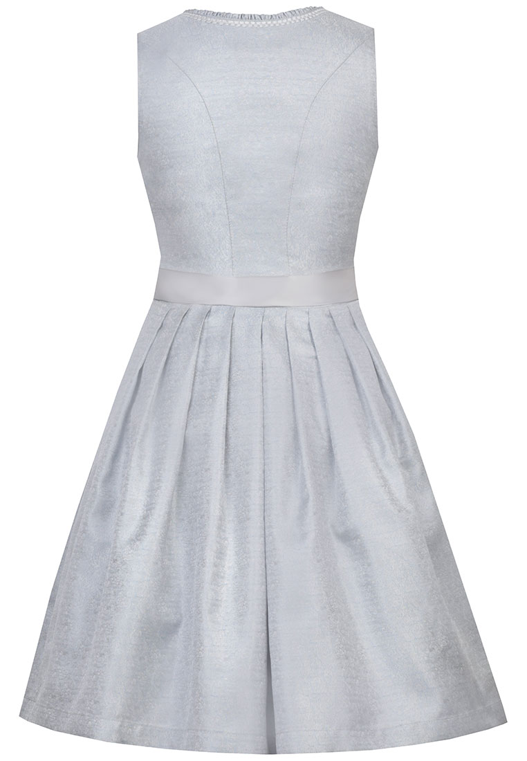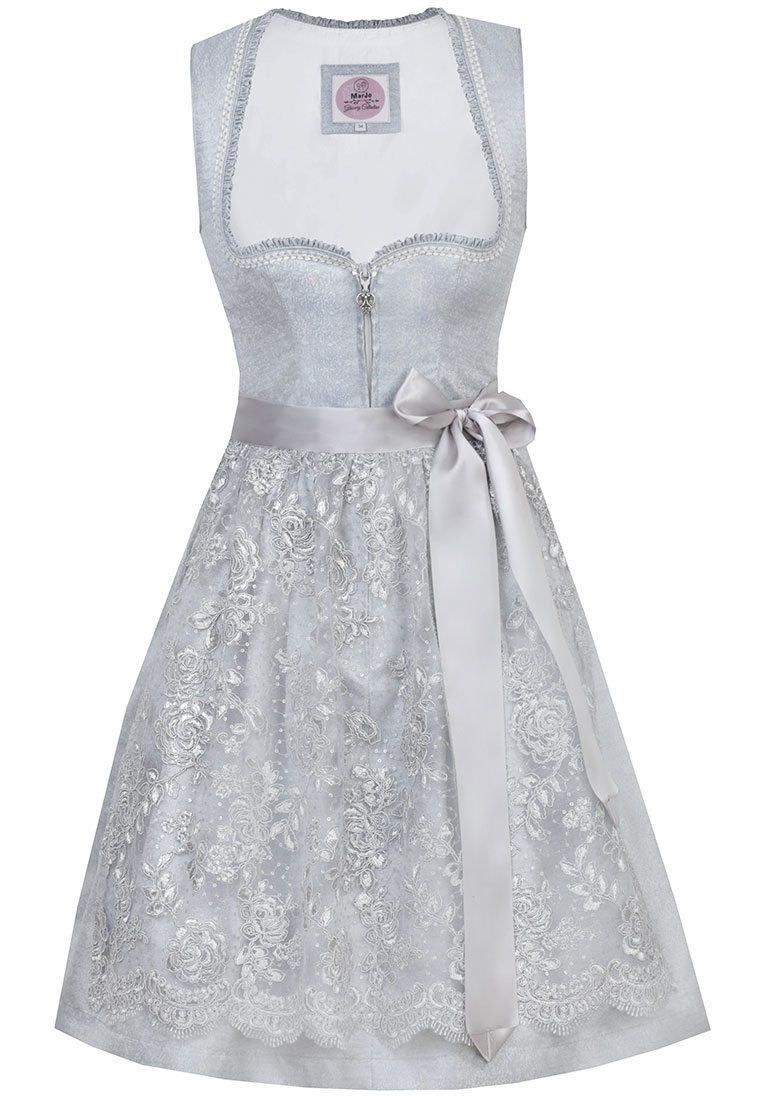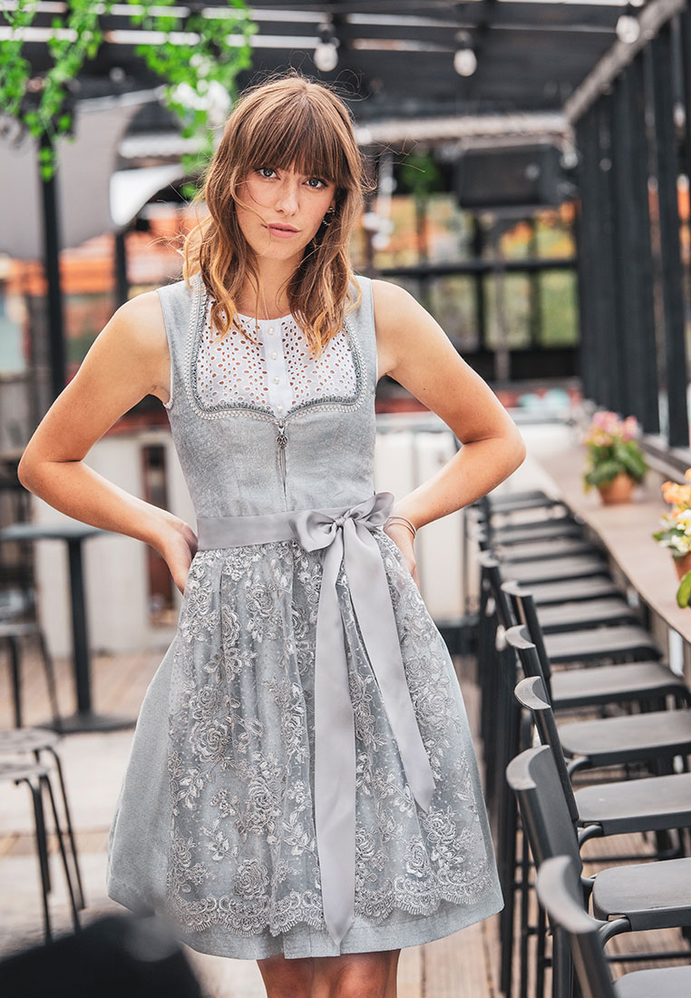 Das Mini-Dirndl Lynn in der Dirndlmarke Marjo ist ein bezauberndes Trachtenkleid in der Farbe silbergrau mit Jacquardmuster. Mit einem Reißverschluss in der Mitte der Vorderseite ist das Anziehen besonders einfach und bequem gestaltet. Mit einer Rocklänge von 50 cm, erscheint das Dirndl Lynn charmant und feminin. Die transparente Schürze des Dirndls ist mit einer Blumenstickerei verziert, was dem Outfit einen romantischen Touch verleiht und das Dirndl Lynn zu einem perfekten Begleiter für Frühlingsfeste, das Oktoberfest oder sogar Hochzeiten macht. Besonders praktisch ist, dass Dirndl verfügt über zwei kleine Taschen, die geschickt unter der Schürze platziert sind. Diese ermöglichen es, das Allernötigste stilvoll mitzuführen, ohne auf die Eleganz des Outfits zu verzichten. Eine Dirndlbluse ist im Preis nicht inklusive. Eine tolle Auswahl findest du auch in unserem Shop. Zu diesem Kleid empfehlen wir eine Spitzenbluse in weiss oder creme.