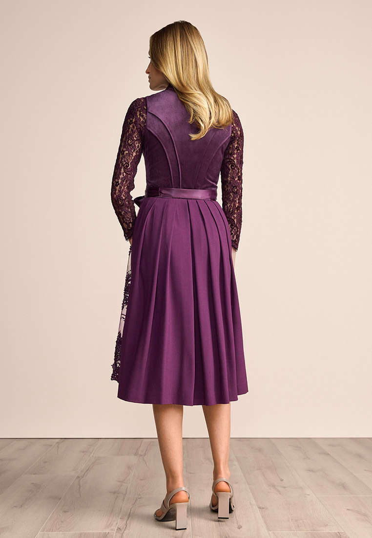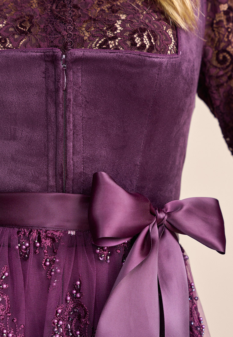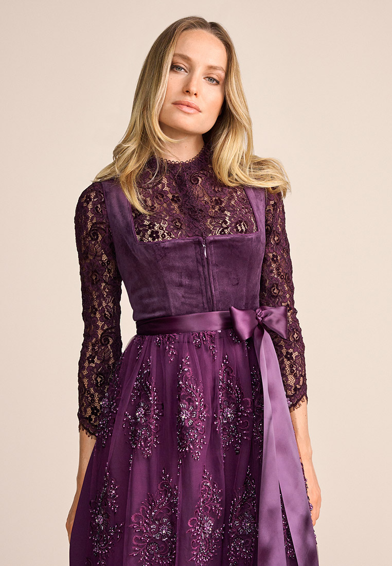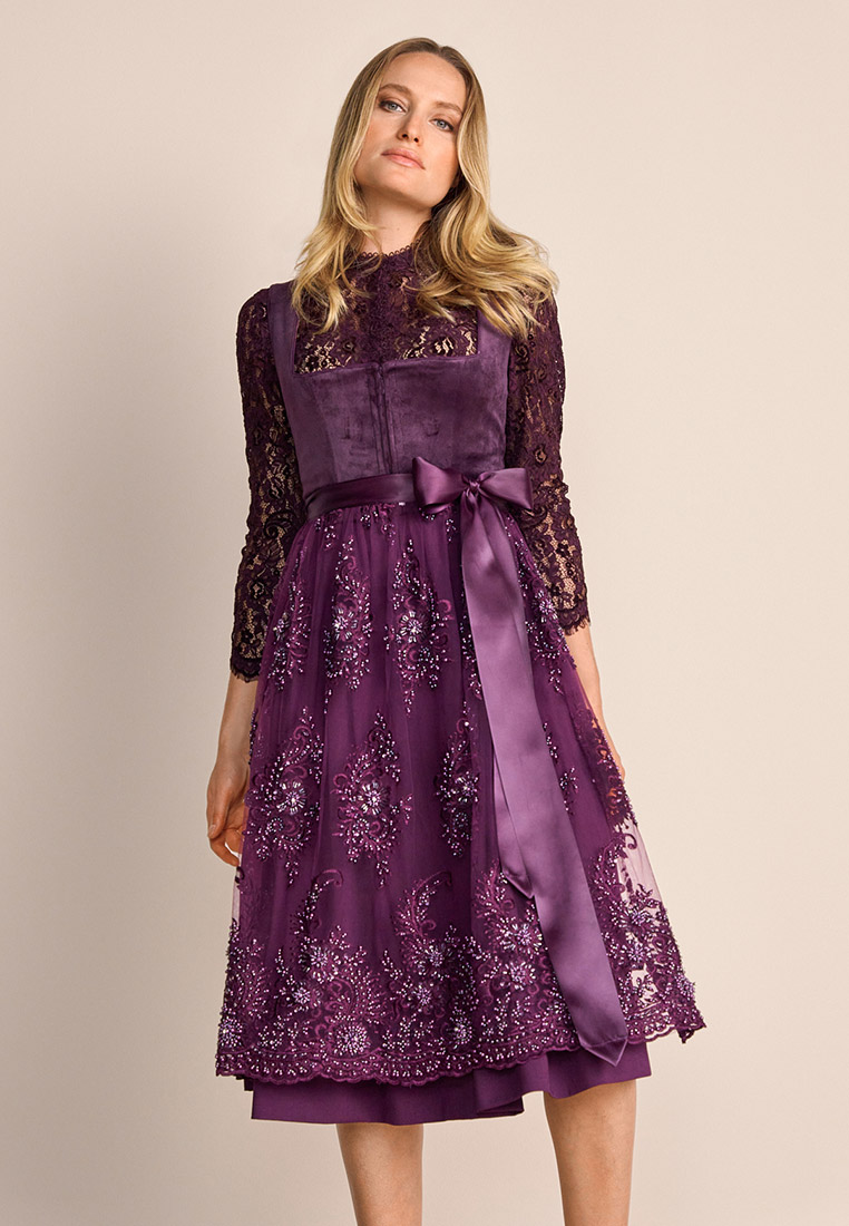 Dieses elegante Krüger Dirndl ist einfach perfekt für die Frau von Welt und vor allem auch für die etwas grössere Lady! Es ist in einem schönen Violett gehalten und besteht aus samtigem Stoff für das Oberteil und einem fallenden Material für den Rock - Ton-in-Ton, versteht sich. Die aufwändige Spitzenschürze ist ein absoluter Blickfang, voller Glitzer und Pailletten! Mit einer Rocklänge von 70 Zentimetern ist es auch noch super elegant. Das Design am Oberteil ist schlicht gehalten, aber trotzdem edel. Ein mittiger Reissverschluss sorgt für einfaches An- und Ausziehen. Für die perfekte Dirndlbluse schau einfach mal in unserem Sortiment vorbei - wir haben eine tolle Auswahl! Mit diesem Dirndl bist du an jedem Schlagerevent, Oktoberfest und bei jeder Trachtenhochzeit richtig gestylt. Das Dirndl aus der Krüger Collection Edition ist ein absolutes Muss für die Dame mit Stil.