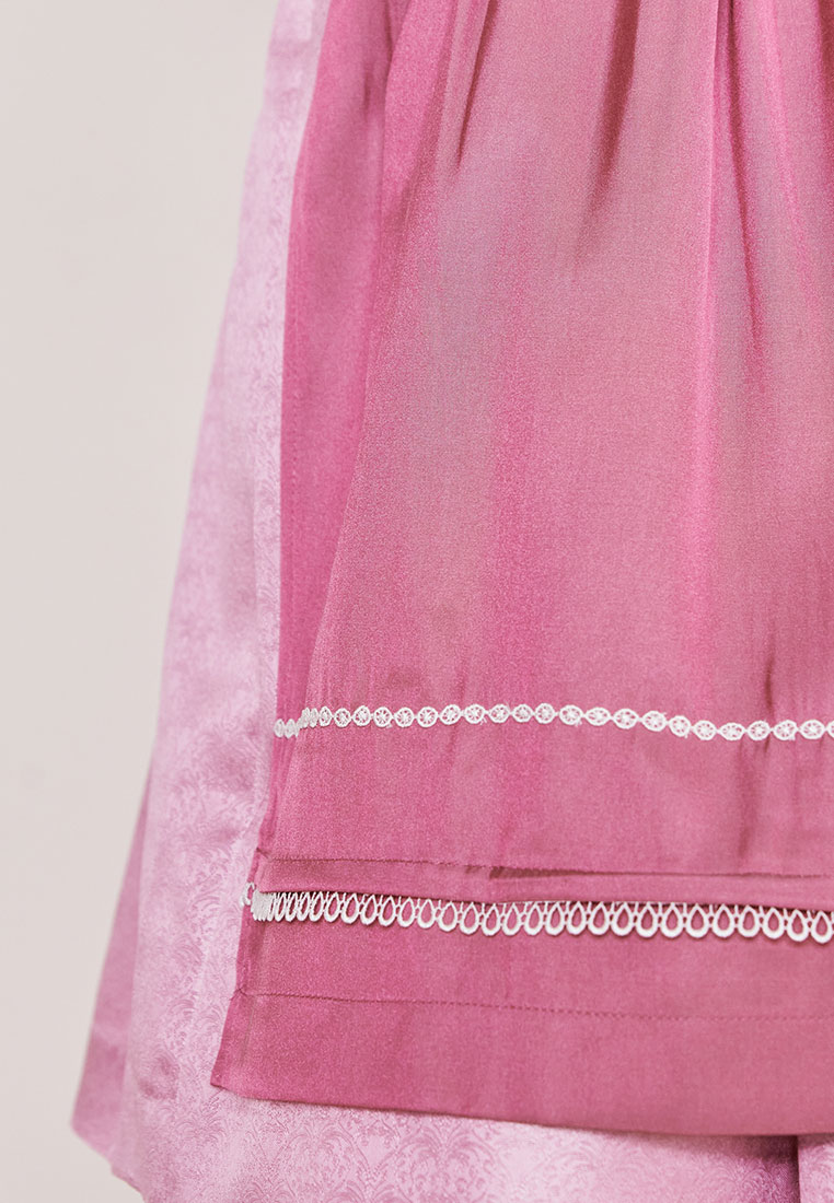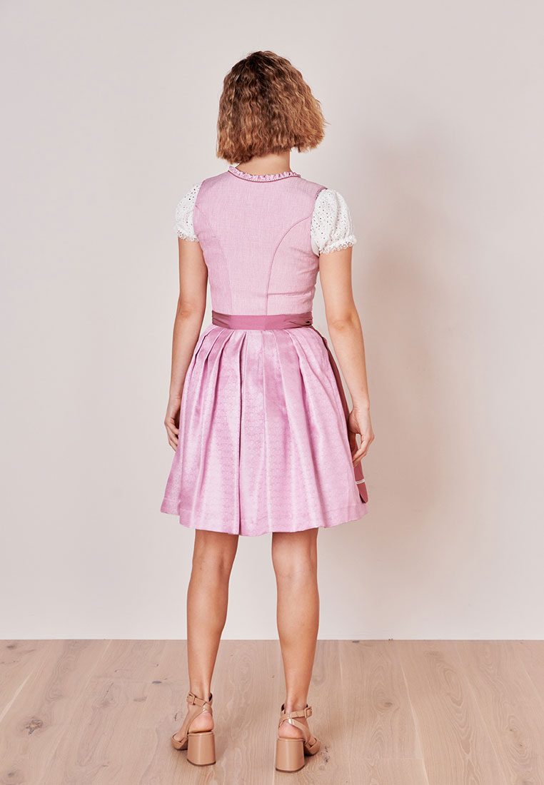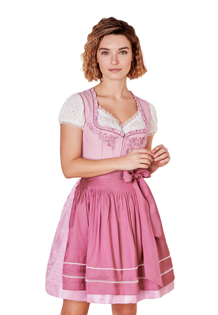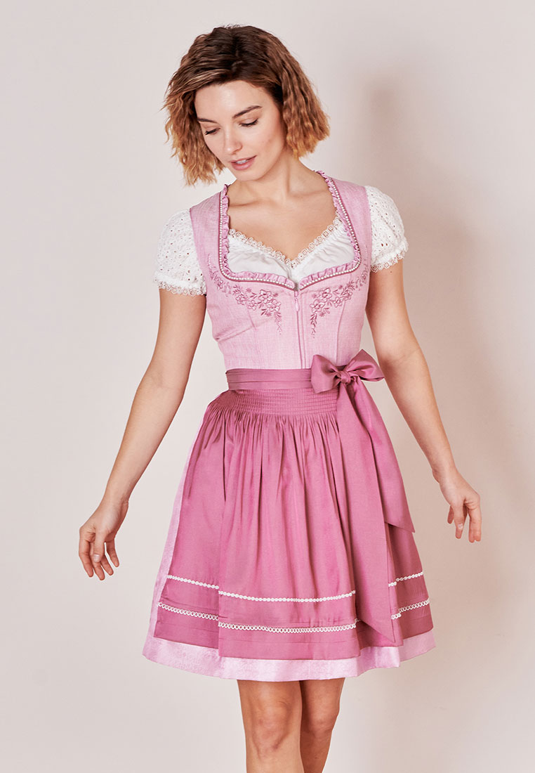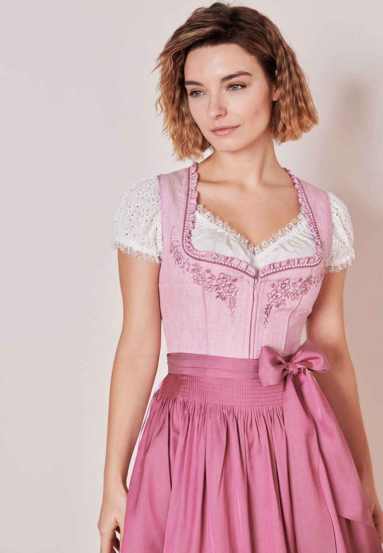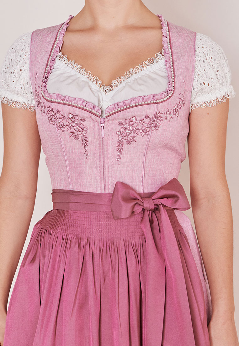 Ein sehr schönes Dirndl in altrosa und weiss. Die weisse Verzierung verleiht der Tracht einen unglaublich frischen Look. Die kleinen Perlen in der Verzierung ums Decolleté sind ein echter Blickfang. Das Kleid wird in der Länge 50cm geliefert. Eine Bluse ist nicht im Preis inklusive. Du findest tolle Spitzenblusen in unserem Sortiment. Und wer es schlichter mag, trägt dazu eine Baumwollbluse in weiss.