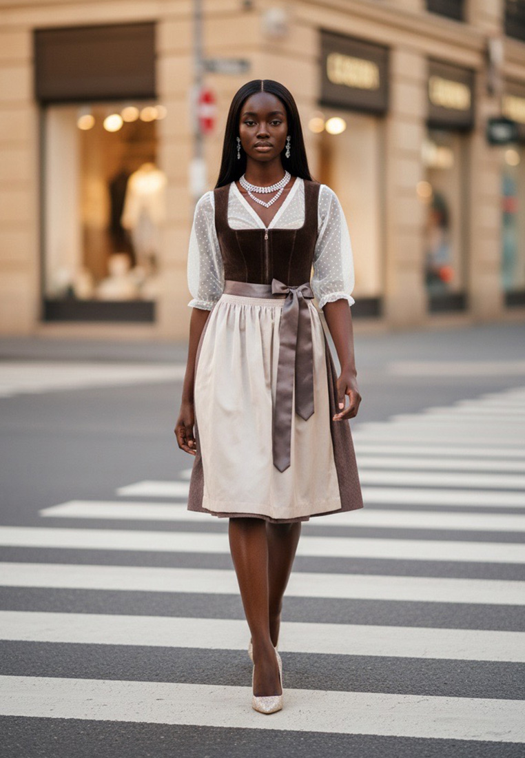 Das Dirndl Bidingen lakritz von Marjo Trachten besticht durch seine elegante Schlichtheit und die besondere Ausstrahlung in tiefem Schwarz. Mit seiner Rocklänge von 70 cm, die klassisch unter dem Knie endet, wirkt das Dirndl edel und zeitlos. Das hochwertige Samtmieder mit Reissverschluss betont die feminine Silhouette, während die feine Schürze in schimmerndem Ton für eine stilvolle Abrundung sorgt. Besonders schön kombinieren lässt sich das Dirndl mit einer Dirndlbluse in Schwarz für einen modernen und eleganten Look, in Weiss oder Offwhite für eine klassische Note oder in Taupe für ein dezentes, warmes Farbenspiel. Passende Accessoires wie eine kleine Dirndltasche, schlichte Pumps oder Trachtenschmuck unterstreichen den festlichen Charakter dieses Modells. Dieses Dirndl ist ein vielseitiger Begleiter für zahlreiche Anlässe. Ob auf dem Oktoberfest in München, auf der Züri Wiesn, dem Zuger Oktoberfest an einer Trachtenhochzeit, bei Familienfeiern oder festlichen Veranstaltungen – mit dem Dirndl Bidingen lakritz bist du immer geschmackvoll und stilvoll gekleidet. Das Dirndl ist im Wiesnshop in Wallisellen bei Zürich erhältlich oder kann bequem online im Wiesnshop Onlineshop bestellt werden. Kunden profitieren von kostenlosem Versand innerhalb der Schweiz, schnellen Lieferzeiten und ohne Zollgebühren.