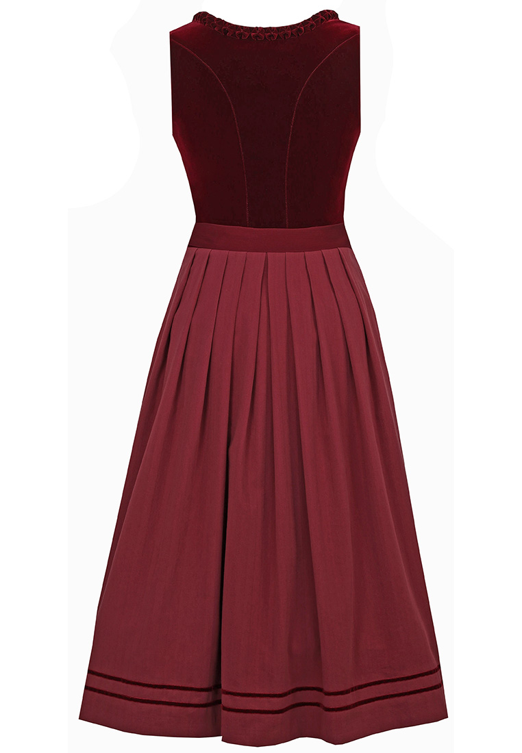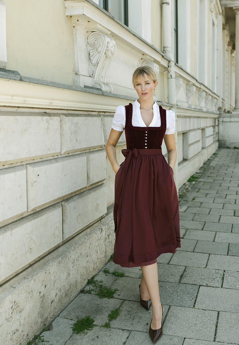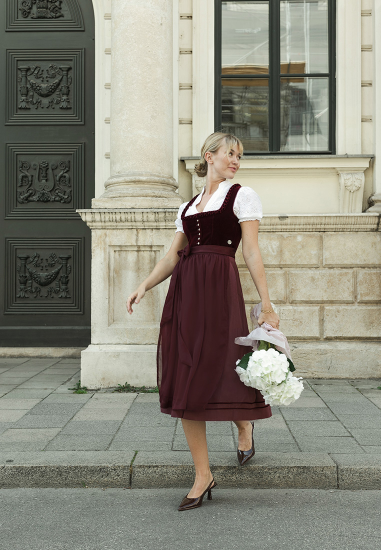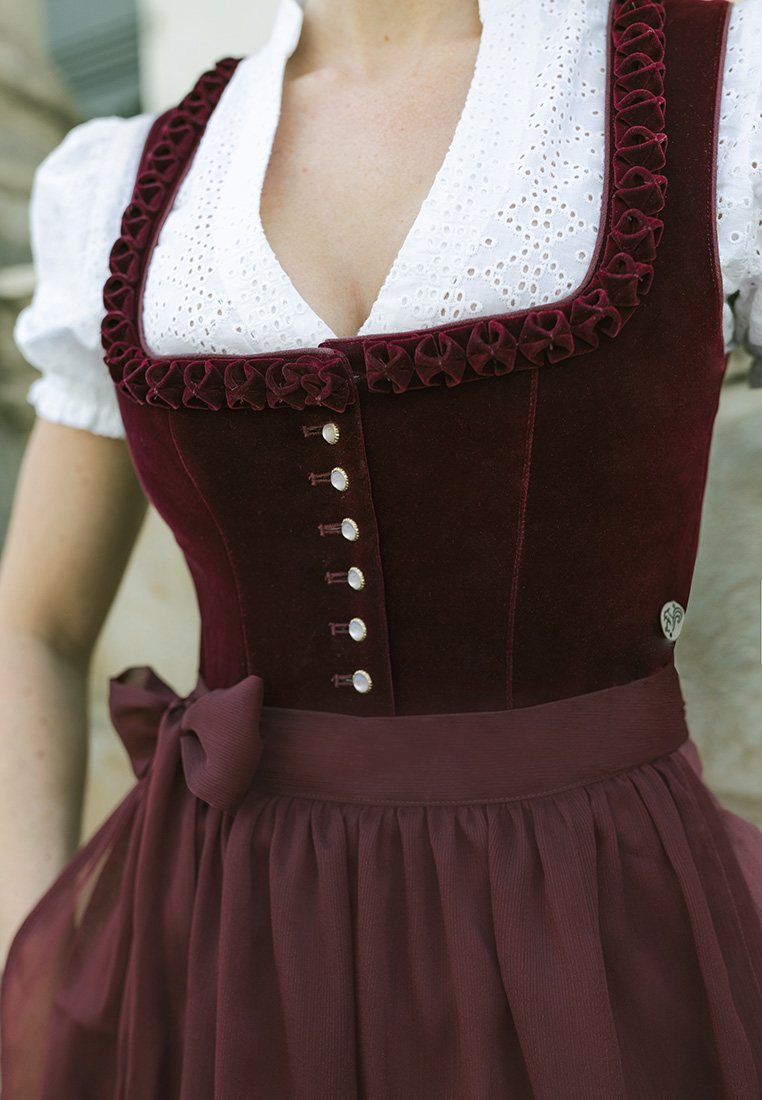 Cherry Chante – Exklusives Dirndl von Teresa Bauer & Marjo Trachten. Eleganz trifft auf moderne Tradition – das Dirndl Cherry Chante in 70 cm Rocklänge ist das Ergebnis einer stilvollen Zusammenarbeit zwischen Marjo Trachten und der bekannten Influencerin Teresa Bauer, die für ihre Liebe zur Trachtenmode bekannt ist und selbst leidenschaftlich gern Dirndl trägt. Gemeinsam wurde ein Modell entworfen, das moderne Raffinesse mit traditionellem Charme verbindet.Das Oberteil aus edlem Samt mit dekorativer Froschgoscherl-Borte wird durch feine Knöpfe in Gold- und Glasoptik ergänzt. Der weich fallende Rock schwingt sanft bei jeder Bewegung und wird durch ein edles Samtdekor am Saum veredelt. Die farblich abgestimmte Organza-Schürze rundet den Look harmonisch ab. Ein echtes Highlight für besondere Anlässe – deshalb haben wir dieses Dirndl extra für euch in die Schweiz geholt.