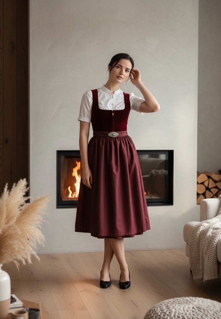 Das Dirndl Grafling in der Farbe Rotwein vereint traditionelle Eleganz mit einer warmen, tiefen Farbgebung, die sofort ins Auge fällt. Der edle Rotton verleiht dem Kleid eine ausdrucksstarke und zugleich feminine Note, während der klassische Schnitt eine zeitlose Silhouette zaubert. Das Mieder schmiegt sich perfekt an und wird durch liebevolle Details stilvoll in Szene gesetzt. Mit einer Rocklänge von 65 cm reicht das Dirndl bis knapp über das Knie und bietet damit die ideale Balance zwischen klassisch und modern. Die farblich abgestimmte Schürze mit feinem Muster bringt Leichtigkeit ins Gesamtbild und ergänzt den kräftigen Grundton auf harmonische Weise. Das Dirndl Grafling Rotwein ist die perfekte Wahl für stilvolle Auftritte – ob beim Volksfest, einer Hochzeit oder einem festlichen Anlass.