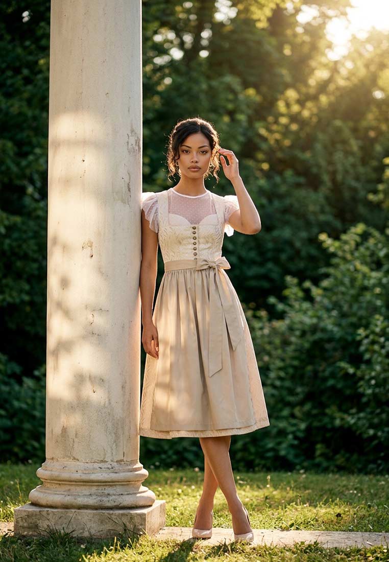 Das Dirndl Griesstätt in edlem Taupe von Marjo verbindet klassische Eleganz mit einem modernen Touch. Das schimmernde Mieder mit stilvollem Muster und dekorativen Knöpfen sorgt für eine feminine Silhouette, während die Schleife an der Taille einen charmanten Akzent setzt. Der Rock mit einer Länge von 70 cm fällt fliessend und bietet durch den dezenten Glanz sowie das transparente Spitzen-Detail am Saum eine besonders hochwertige Optik. Perfekt für festliche Anlässe, Hochzeiten oder traditionelle Feiern – dieses Dirndl lässt Herzen höherschlagen und unterstreicht deine stilvolle Ausstrahlung auf ganz besondere Weise. Entdecke jetzt das Dirndl Griesstätt in Taupe von Marjo – stilvoll, elegant und perfekt für festliche Anlässe. Mit 70 cm Rocklänge und edlen Details ein echter Blickfang.