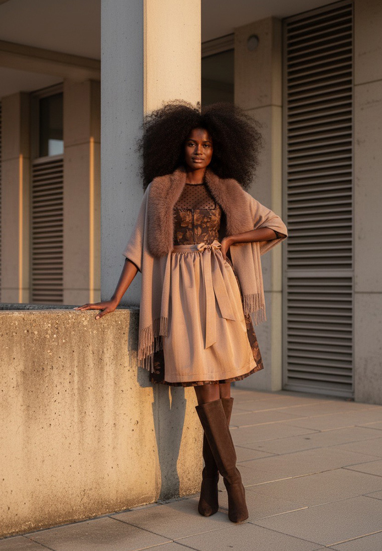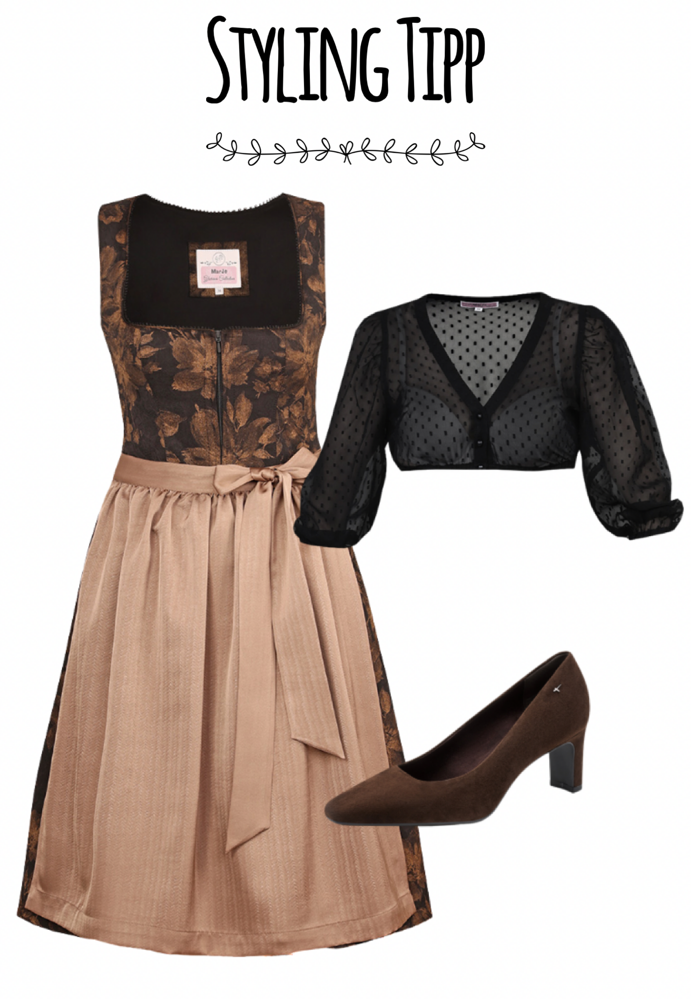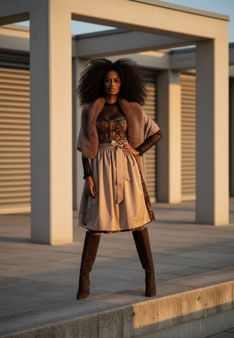 Ein Dirndl mit Stil und Ausstrahlung: Das Modell Iggensbach von MarJo vereint klassische Eleganz mit opulenter Stoffwahl. Das tiefschwarze Mieder ist mit einem edlen, floralen Muster in schimmerndem Taupe durchzogen und wird von einer feinen, runden Borte am Ausschnitt eingerahmt. Die aufwendige Struktur des Jacquardstoffs verleiht dem Kleid Tiefe und Charakter. Der Rock in knieumspielender Länge (65 cm) wird von einer glänzenden Schürze in Taupe akzentuiert, die dem Dirndl einen festlichen und zugleich modernen Look verleiht. Ideal für Abendveranstaltungen, elegante Volksfeste oder als stilvolles Hochzeitsgast-Outfit. Ein Dirndl, das durch seine raffinierte Farbgebung und die edle Haptik besticht.