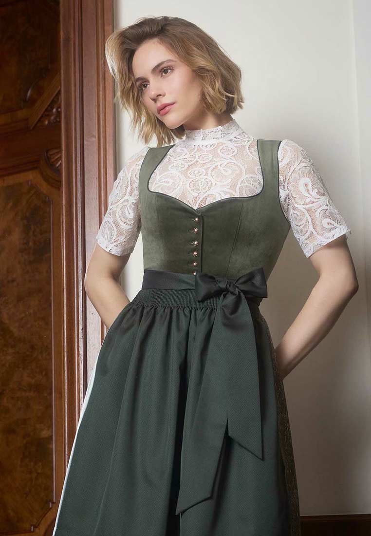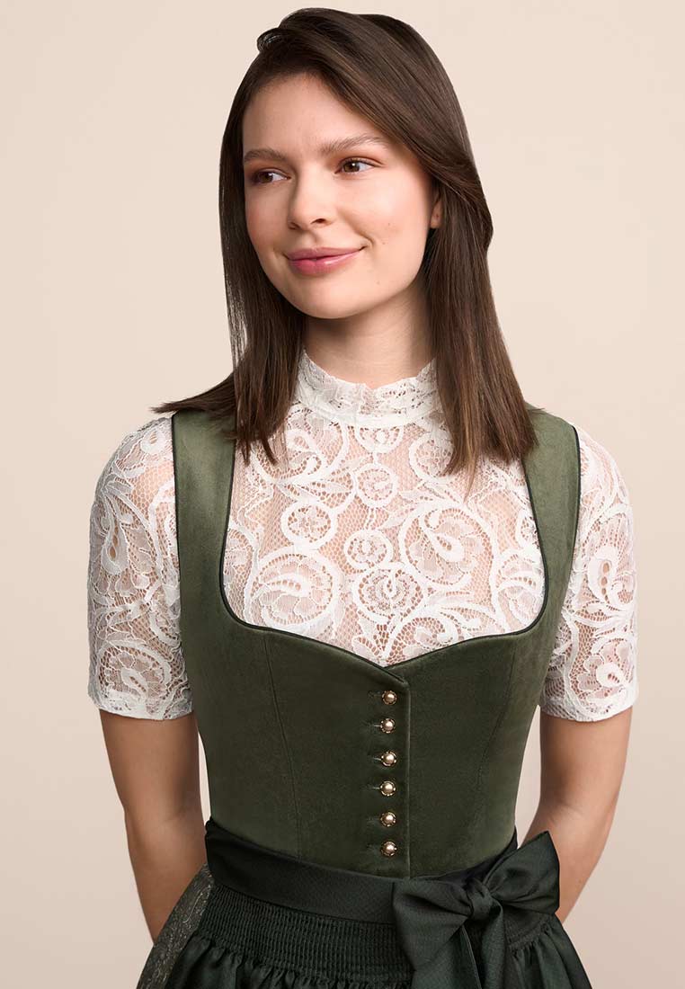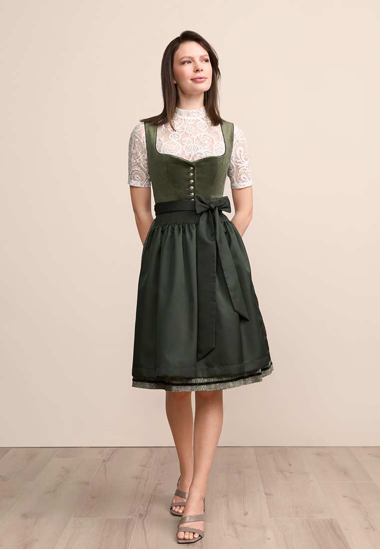 Klassische Eleganz trifft auf moderne Raffinesse – das Dirndl Iny in 60cm Rocklänge in edlem Dunkelgrün ist ein echtes Highlight für stilbewusste Trachtenliebhaberinnen. Der Mieder aus hochwertigem, samt ähnlichem Stoff betont die Taille und zaubert dank der klassischen Knopfleiste und dem tiefen Ausschnitt eine feminine, aber dennoch elegante Silhouette.Besonders ins Auge fällt die wunderschön gearbeitete Schürze aus filigraner Spitze, die dem Dirndl einen Hauch von Luxus verleiht. Der farblich abgestimmte Schürzenstoff schimmert dezent und wird durch eine grosszügige Schleife stilvoll in Szene gesetzt. Die Rocklänge von 60 cm sorgt für einen modernen Look, der sowohl auf Volksfesten als auch bei festlichen Anlässen perfekt zur Geltung kommt. Das Dirndl Iny verbindet traditionelle Trachtenmode mit aktuellen Designakzenten – ideal für Frauen, die zeitlose Schönheit und Qualität zu schätzen wissen. Trage dieses Dirndl zur Wiesn in München oder zum Oktoberfest in der Schweiz.