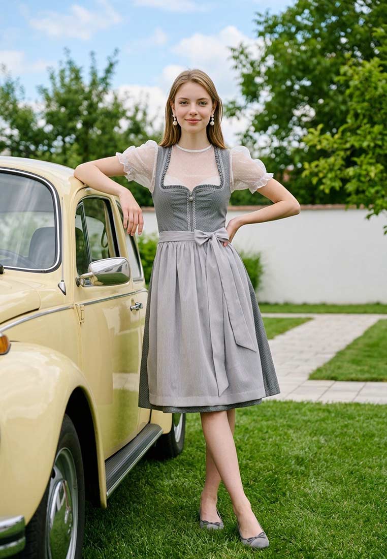 Schlichte Eleganz trifft moderne Zurückhaltung: Das Dirndl Kaufbeuren in einem stilvollen Taubenblau ist ein zeitloser Klassiker mit edlen Details. Das fein gemusterte Mieder ist mit einer dekorativen Borte und Rüschen entlang des Ausschnitts verziert und wird mit einem dezenten Reissverschluss geschlossen. Der weich fallende Rock endet in knieumspielender Länge und wird von einer zarten, tonigen Schürze begleitet, die dem Look Leichtigkeit und Raffinesse verleiht. Gefertigt aus einer pflegeleichten Polyester-Baumwollmischung, bietet dieses Dirndl optimalen Komfort bei gleichzeitig hochwertigem Erscheinungsbild – ideal für traditionelle Feste und stilvolle Auftritte. Ein vielseitiges Dirndl mit dezentem Charme – für Frauen, die moderne Klassik lieben.