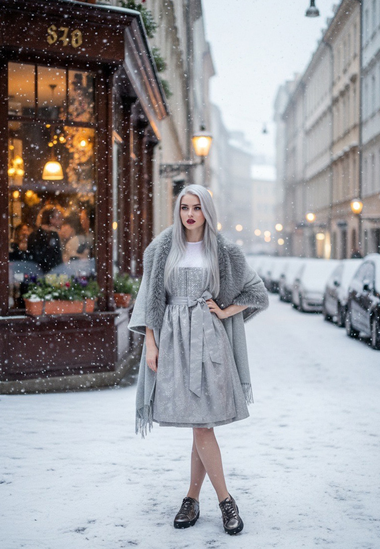 Das Dirndl Kollnburg von MarJo Trachten ist ein eleganter Hingucker in edlem Lichtgrau. Das funkelnde Paillettenmieder verleiht dem Look eine glamouröse Note, während der Rock in 65 cm Länge und die fein strukturierte Schürze für eine feminine, stilvolle Ausstrahlung sorgen. Der eckige Ausschnitt und das breite Schleifenband unterstreichen die elegante Silhouette und machen dieses Dirndl zur perfekten Wahl für besondere Anlässe, Hochzeiten oder das Oktoberfest. Besonders edel wirkt das Dirndl in Kombination mit einer transparenten Dirndlbluse, wie der Estella Bluse von My Choice – mit feinen Silbersprenkeln und luftigen Ärmeln. Sie rundet den Look modern und gleichzeitig festlich ab und bringt das glitzernde Mieder wunderschön zur Geltung. Erhältlich bei Wiesnshop in Wallisellen – oder ganz bequem online bestellen, natürlich ohne Zollkosten und mit schnellem A-Post-Versand innerhalb der Schweiz.