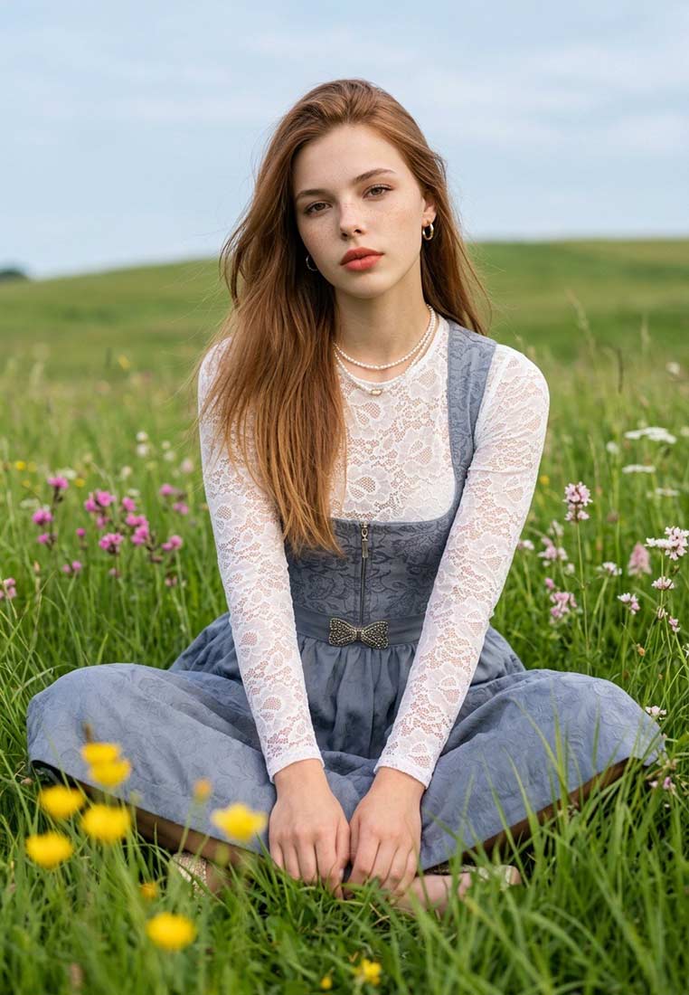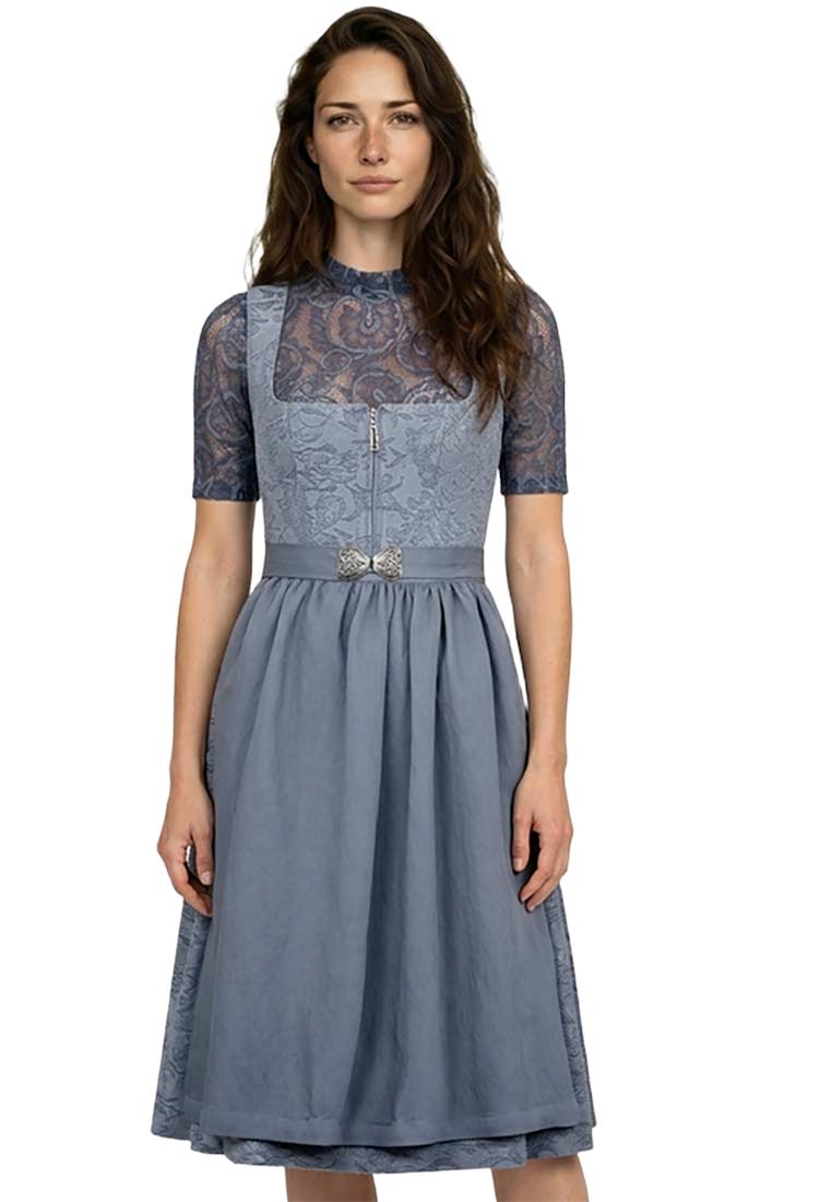 Ein stilvoller Auftritt für das Oktoberfest und jede Festlichkeit: Das Dirndl Jocelyn von Krüger vereint klassische Eleganz mit modernen Akzenten. In einem feinen Blauton gehalten, besticht es durch ein liebevoll gestaltetes Mieder mit dekorativer Bortenverzierung entlang des Ausschnitts und einem praktischen Frontreissverschluss. Der 60 cm lange Rock ist feminin und schwungvoll geschnitten, die farblich abgestimmte Schürze mit breitem Bindeband sorgt für eine harmonische Silhouette und setzt die Taille perfekt in Szene. Hochwertige Stoffe und eine detailverliebte Verarbeitung machen dieses Modell zum idealen Begleiter für das Oktoberfest, Familienfeiern oder traditionelle Veranstaltungen.