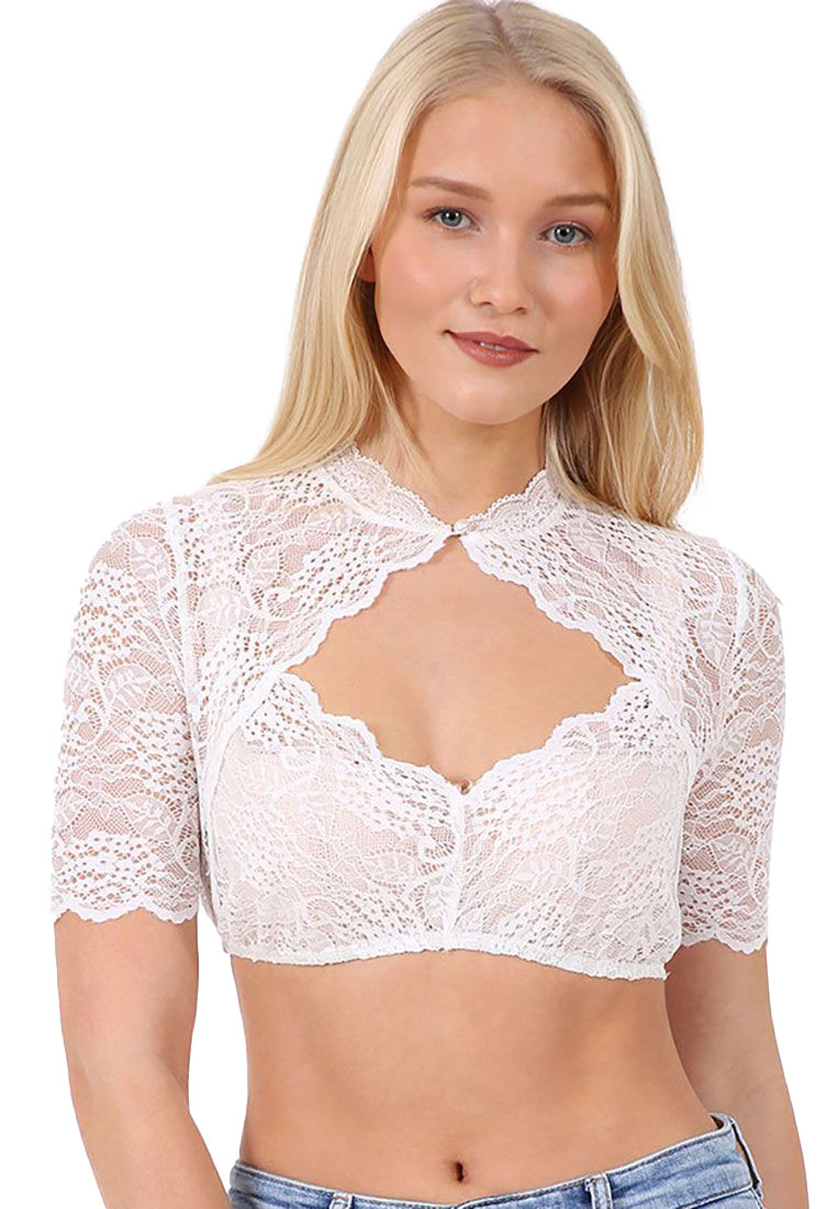 Sexy Trachtenbluse der Marke Krüger, die einerseits schön hochgeschlossen ist, andererseits aber ein verführerischer Ausschnitt im Dekollete hat.