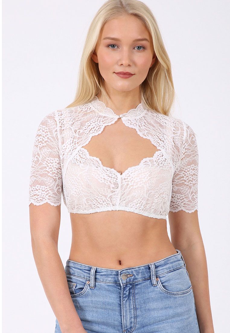 Hinreißende Dirndlbluse. Die Dirndlbluse Cassandra überzeugt durch eine hochwertige Spitze. Das Material ist elastisch und schmiegt sich angenehm an. Die Länge der Arme ist 3/4.