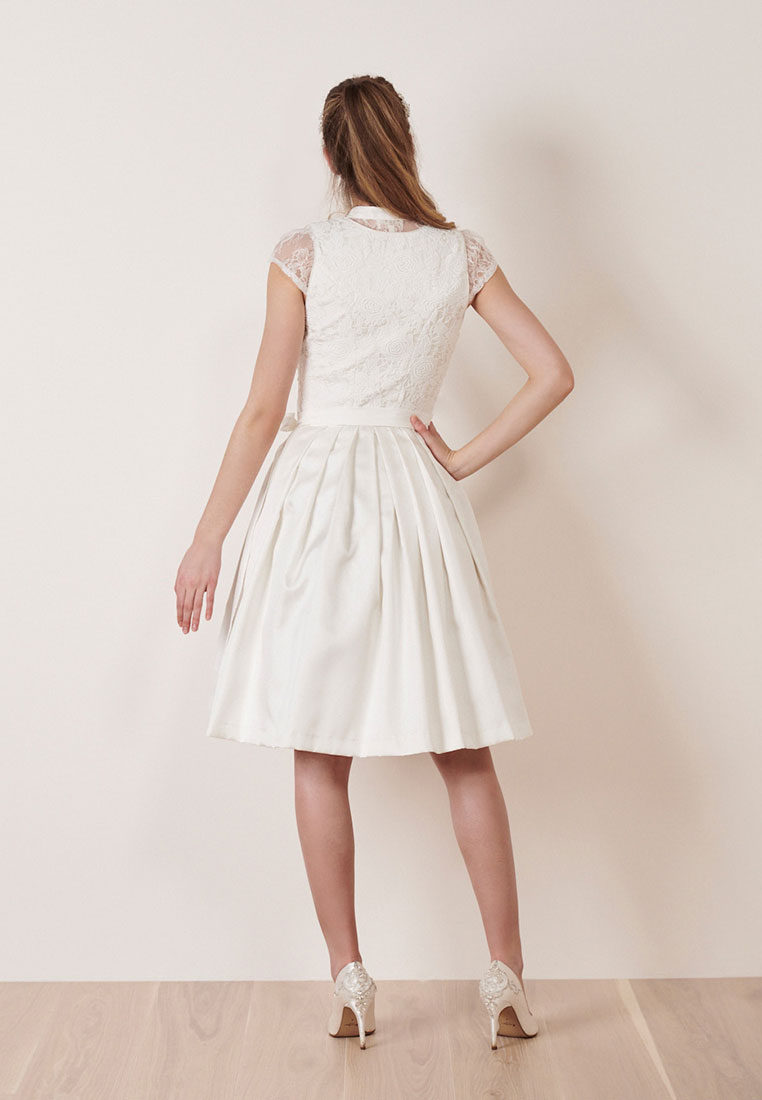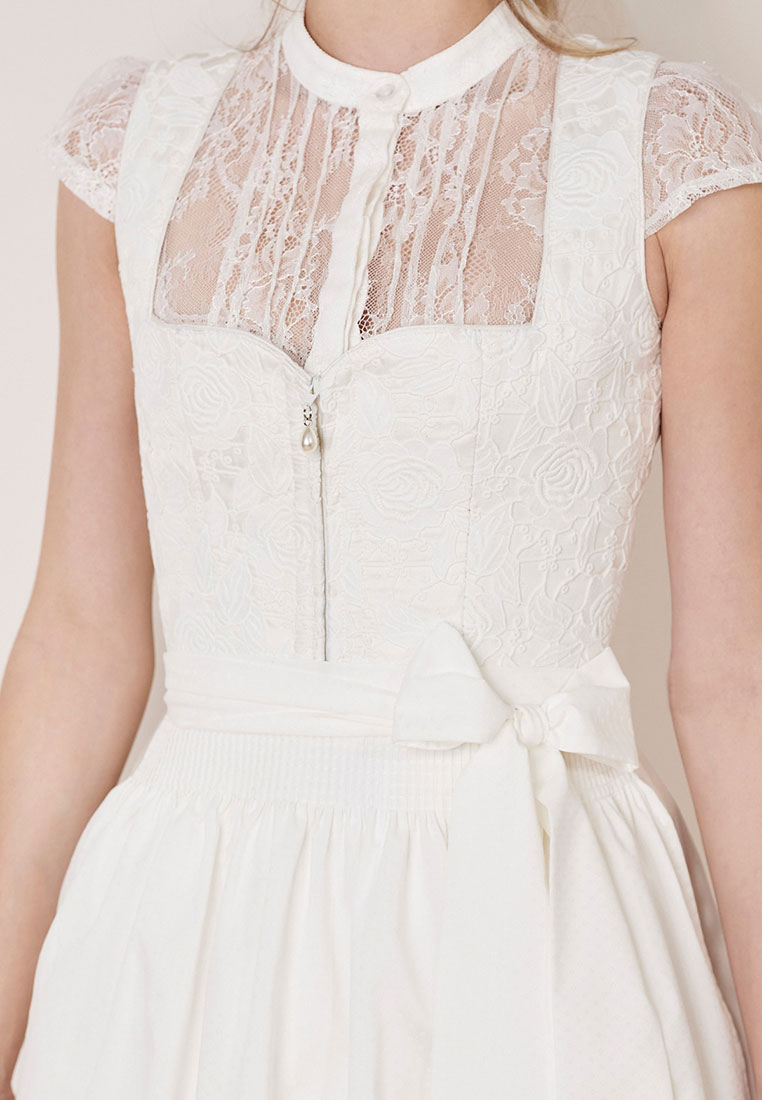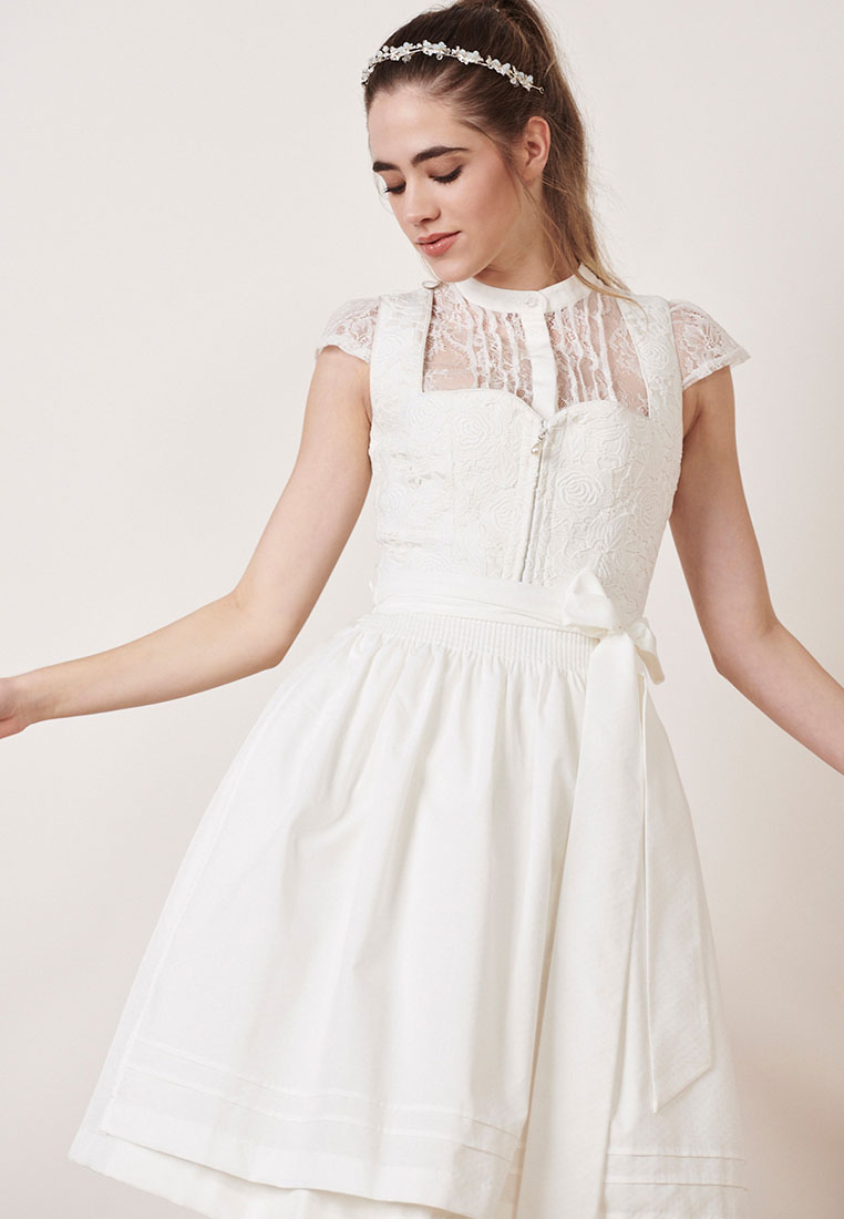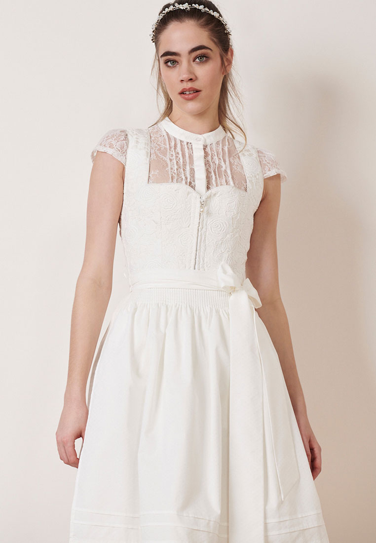 Das umwerfende Hochzeitsdirndl Leora verzaubert durch ein florales Spitzendesign. Die schlichte Dirndlschürze und der schöne Perlenanhänger vollenden den romantischen Look des Dirndls. Das Model ist 1,71m groß und trägt auf diesem Foto das Dirndl in der Rocklänge 60cm. Eine Bluse ist nicht im Lieferumfang enthalten. Du findest aber viele tolle passende Blusen in unserem Sortiment.
