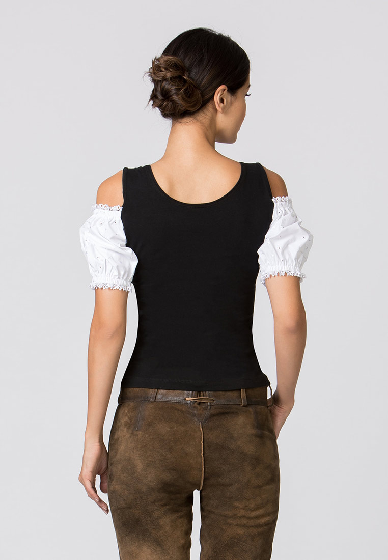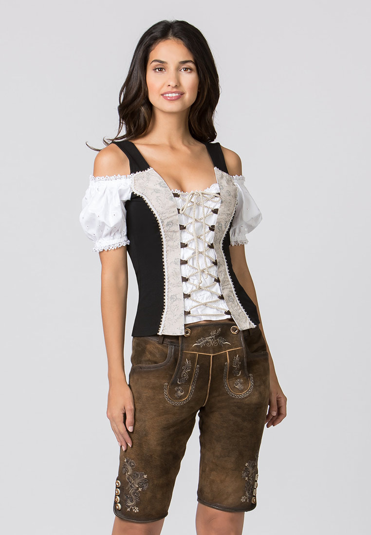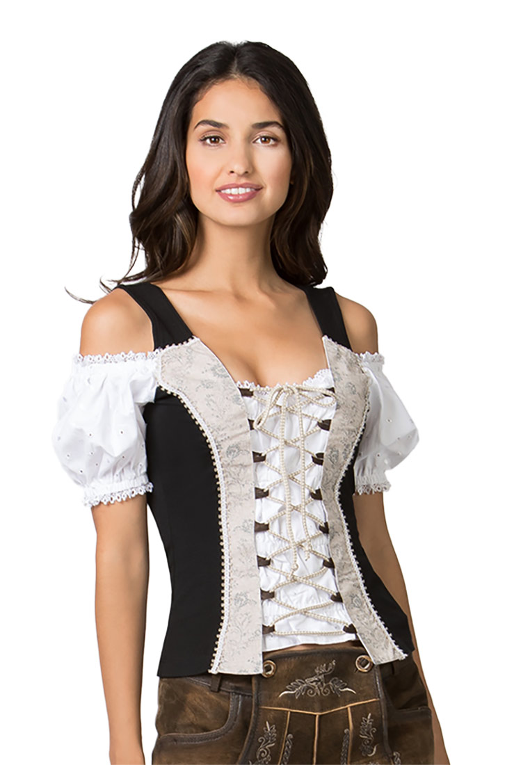 Trachtenmieder May für Damen von der Marke Stockerpoint in schwarz. Das elegante Landhaus Trachtenshirt besticht durch seinen pflegeleichten Materialmix und liebevollen Details. Die feminine Passform wird durch eine raffinierte Miederschnürung erreicht. Die schulterlosen Ärmel runden das Erscheinungsbild ab. Das Shirt ist der ideale Kombipartner zu Röcken, Jeans und Lederhosen.
