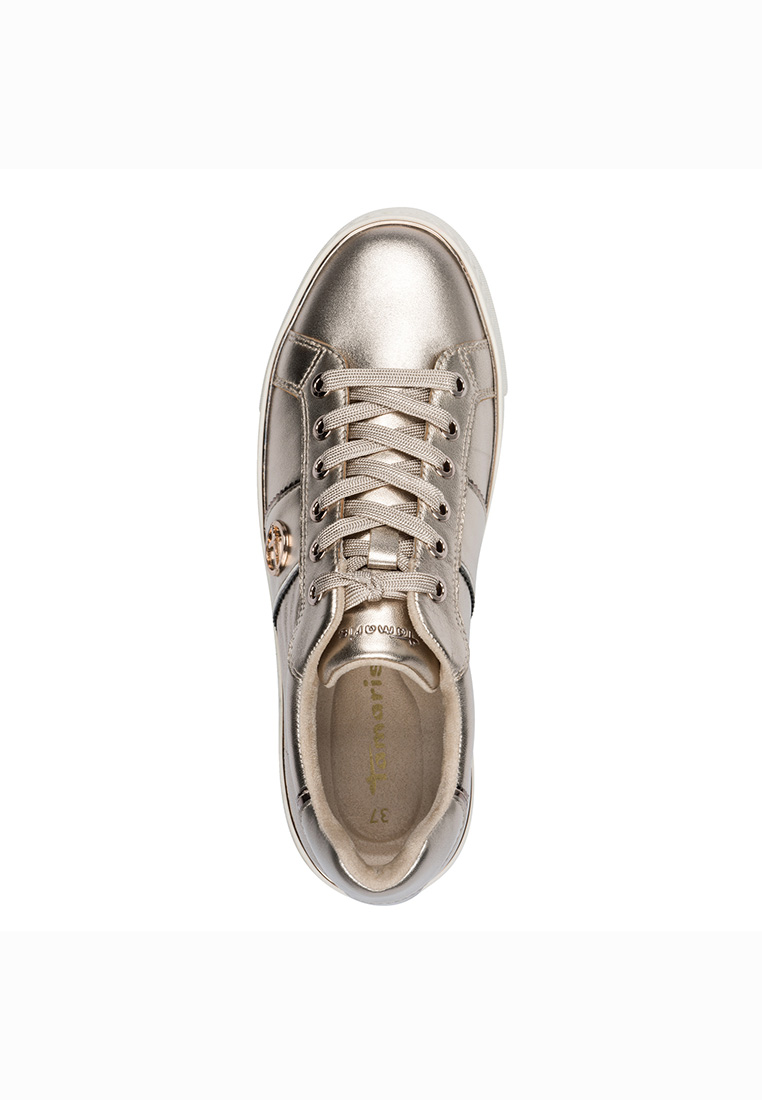 Der Tamaris Sneaker Light Gold vereint einen luxuriösen Look mit sportlicher Lässigkeit. Sein schimmerndes goldenes Obermaterial verleiht jedem Outfit einen eleganten Touch, während die dezente Plateau-Sohle (35mm) für eine moderne Silhouette sorgt. Feine Details wie das metallische Tamaris-Logo an der Seite und die goldenen Ösen unterstreichen das edle Design. Perfekt kombinierbar mit einem Dirndl, Jeans oder Kleidern – dieser Sneaker setzt ein modisches Statement und lässt sich sowohl im Alltag als auch zu besonderen Anlässen tragen.