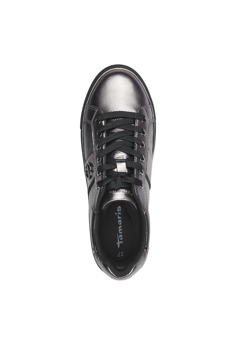 Die Sneaker "Pewter" von Tamaris sind ein stilvolles und bequemes Schuhwerk, das durch sein glänzendes silber-schwarzes Design auffällt. Mit einer Sohlenhöhe von 3,5 cm bieten sie eine angenehme Höhe und unterstützen den Fußkomfort. Hergestellt aus einem Materialmix aus Leder und Synthetik, vereinen sie Langlebigkeit und modernes Design. Ideal für einen lässigen, aber dennoch eleganten Look.