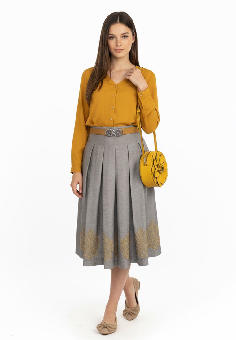 Entdecke die elegante Bluse Aline von b.young in einem strahlenden Goldgelb. Diese langärmlige Bluse überzeugt durch ihre schlichte Eleganz und die dekorativen Knöpfe, die ihr einen besonderen Akzent verleihen. Der klassische Rundhalskragen sorgt für eine feminine Silhouette und macht die Trachtenbluse vielseitig kombinierbar. Ideal für Übergangszeiten oder kühlere Tage, lässt sich die Bluse Aline sowohl lässig mit Jeans als auch schick mit einem Trachten-Rock stylen. Ein absolutes Must-have für jede Garderobe!