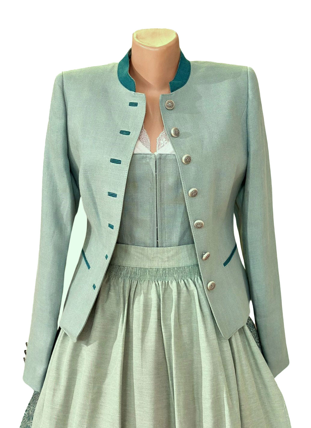 Der Damenblazer Dajana in Türkis von der Trachtenmarke Landgraf ist ein wunderschönes Kleidungsstück, das Eleganz und Stil vereint. Hergestellt aus Leinen bietet dieser Blazer nicht nur einen edlen Look, sondern auch hervorragenden Tragekomfort. Mit seinen zwei kleinen Außentaschen bietet der Trachten-Blazer Dajana praktischen Stauraum für Kleinigkeiten, die du unterwegs griffbereit haben möchtest. Der Blazer ist tailliert geschnitten, was eine feminine Passform und eine schmeichelhafte Silhouette gewährleistet. Die Einfassungen in Petrolgrün an der Taschenöffnung, dem Stehkragen und dem Knopfloch verleihen dem Blazer eine raffinierte Note und setzen einen stilvollen Akzent gegenüber der türkisen Hauptfarbe. Diese Trachtenjacke ist perfekt geeignet für verschiedenste Anlässe und lässt sich vielseitig kombinieren, sei es für einen traditionellen Anlass oder für einen lässig-eleganten Look im Alltag.