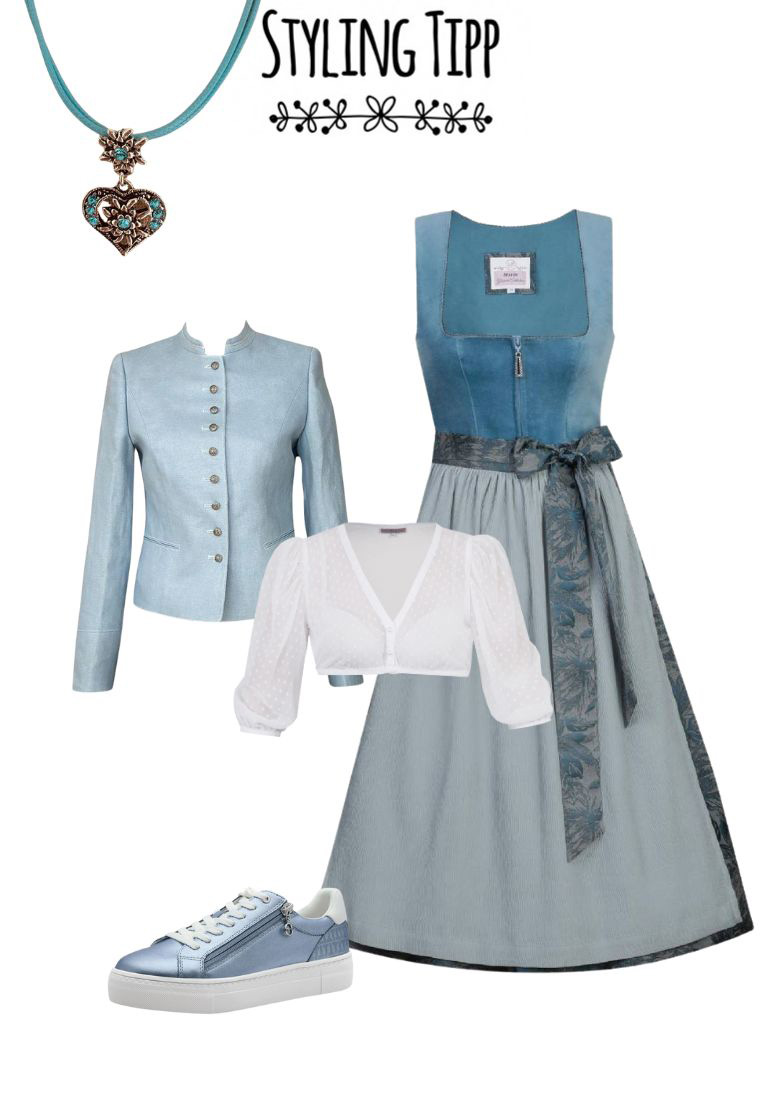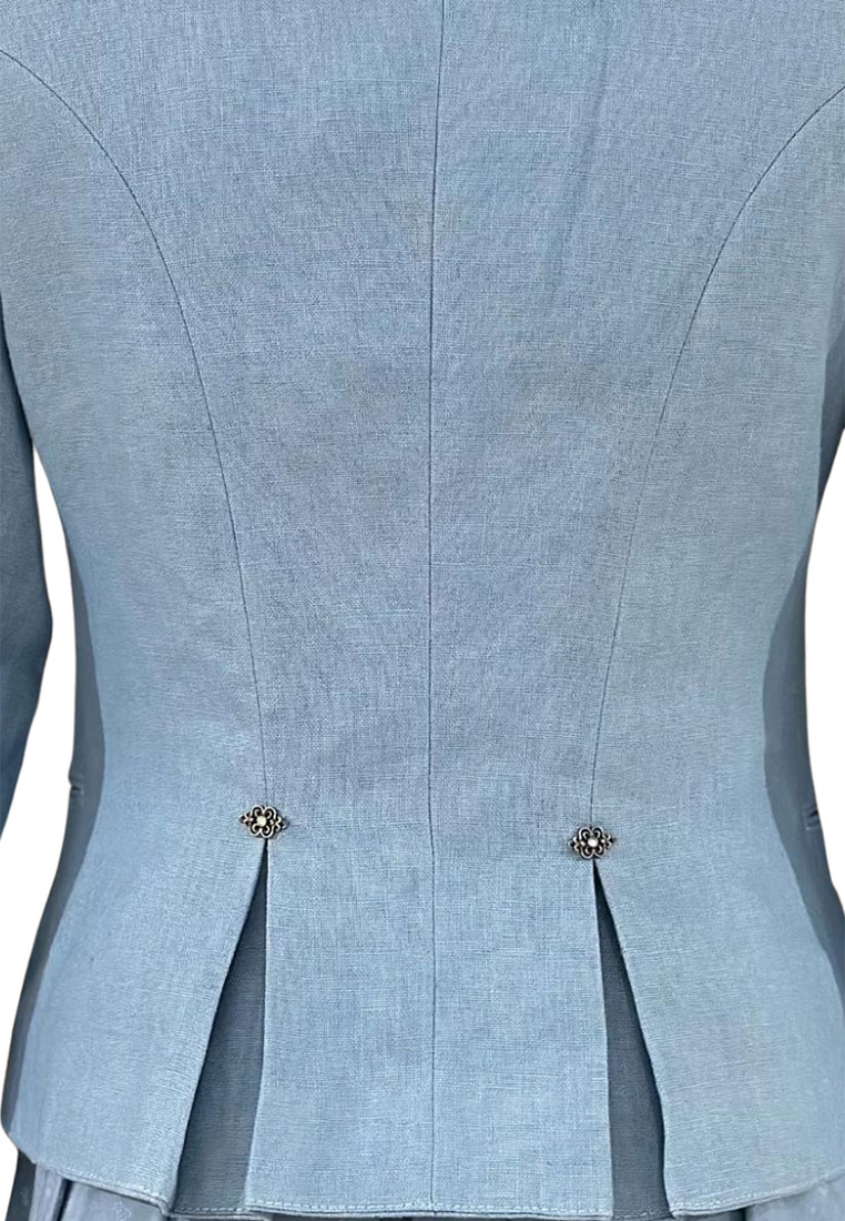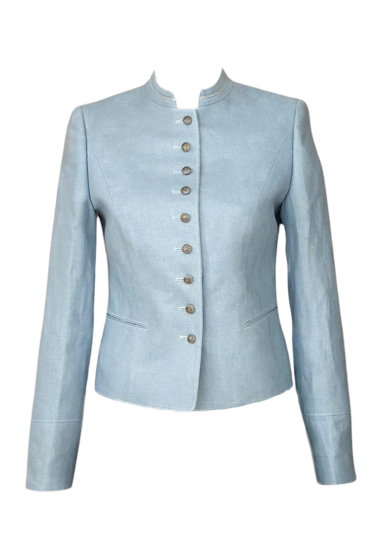 Die Damen Trachtenjacke "Dajana" in Eisblau von der Marke Kaiseralm ist sehr hochwertig und stilvoll! Diese Jacke passt perfekt zum Dirndl "Dajana" in Eisblau. Sie hat schöne Details wie drei kleine runde silberne Knöpfe an den Armen und zwei Verzierungen am Rücken. Die Jacke ist tailliert geschnitten und hat einen eleganten Stehkragen sowie Eingrifftaschen auf der Vorderseite. Damit machst du auf jeden Fall eine elegante Figur auf jedem Fest!
