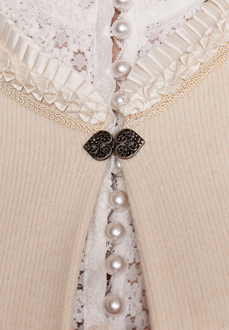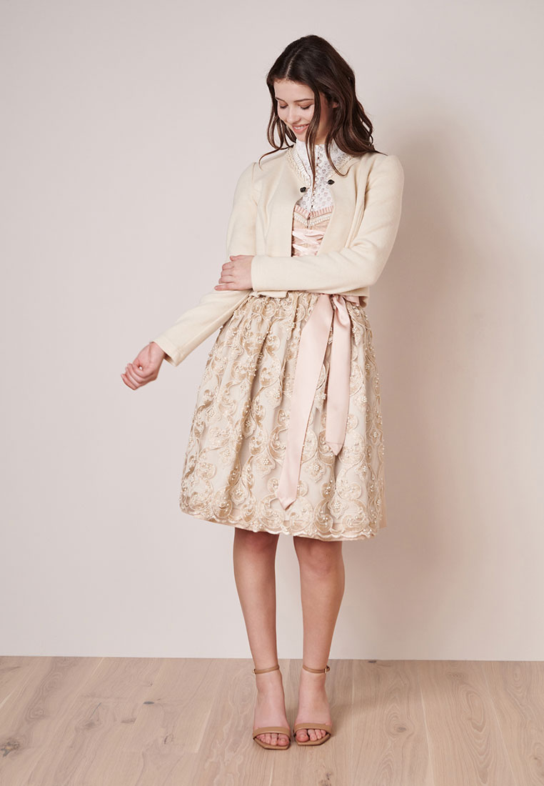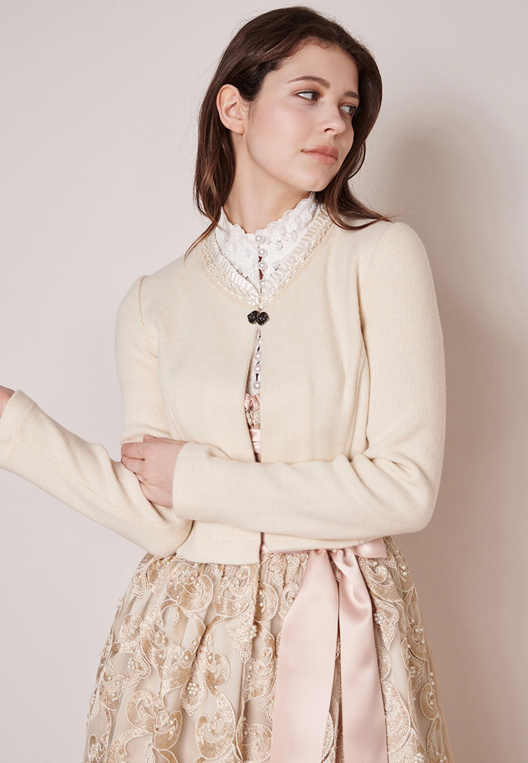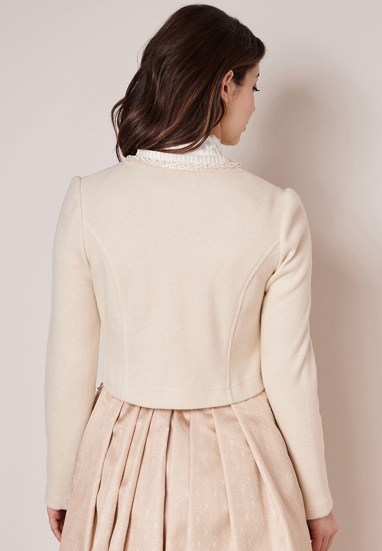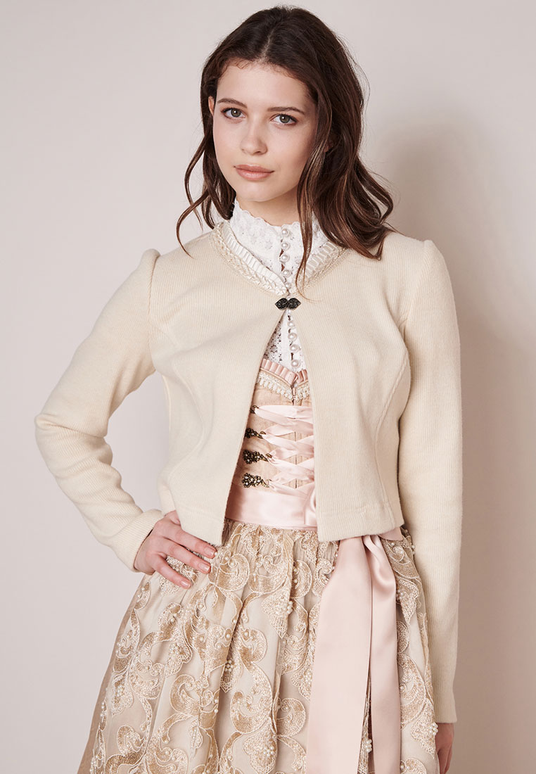 Hier ist die perfekte Trachtenjacke in Ecru! Sie passt super zur Hochzeitstracht oder anderen Dirndloutfits. Die Jacke ist kurz gehalten, damit die Taille richtig zur Geltung kommt. Sie hat einen kleinen Stehkragen und dezente, verdeckte Druckknöpfe zum Verschliessen über der Brust. Die Ärmel sind wunderschön gestaltet und mit kleinen Knöpfen verziert. Eine absolute Traumjacke zu deinem Traumdirndl! Sie stammt aus der Krüger Collection, also kannst du sicher sein, dass du mit dieser Trachtenjacke am Puls der Zeit bist. Setze modische Akzente und sei ein Trendsetter in der Trachtenwelt.