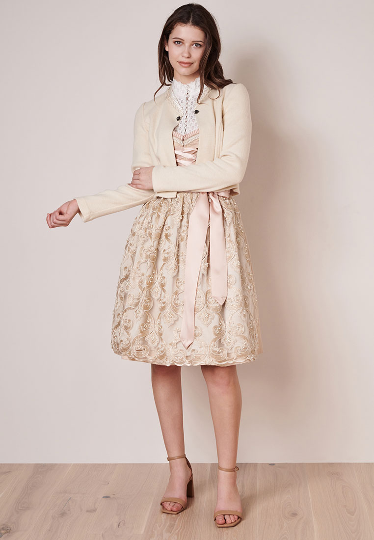 Das Dirndl Malia verfügt über eine umwerfende Stickerei am Mieder. Die Stickerei wird von schönen Perlen und Blumenapplikationen geschmückt. Ein kleiner Reißverschlussanhänger und die Spitzenschürze vollendet den Look. Das Model ist 1,74m groß und trägt auf diesem Foto das Dirndl in der Rocklänge 60cm.
