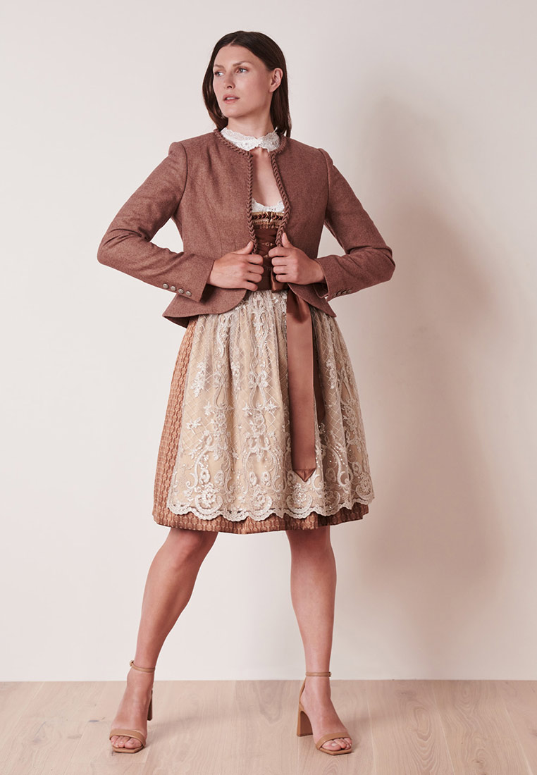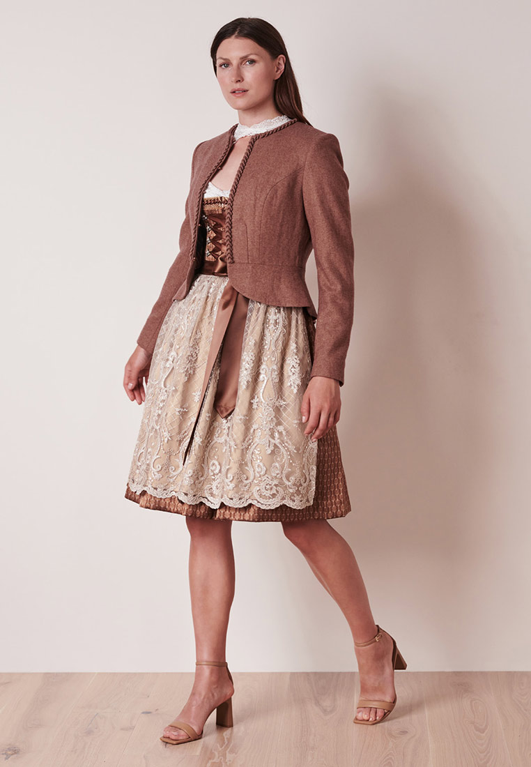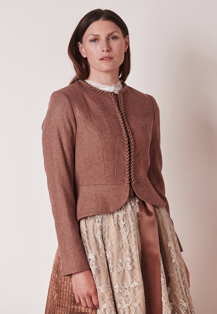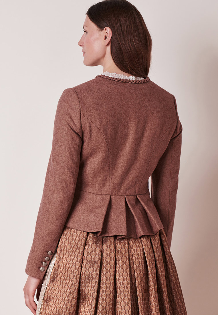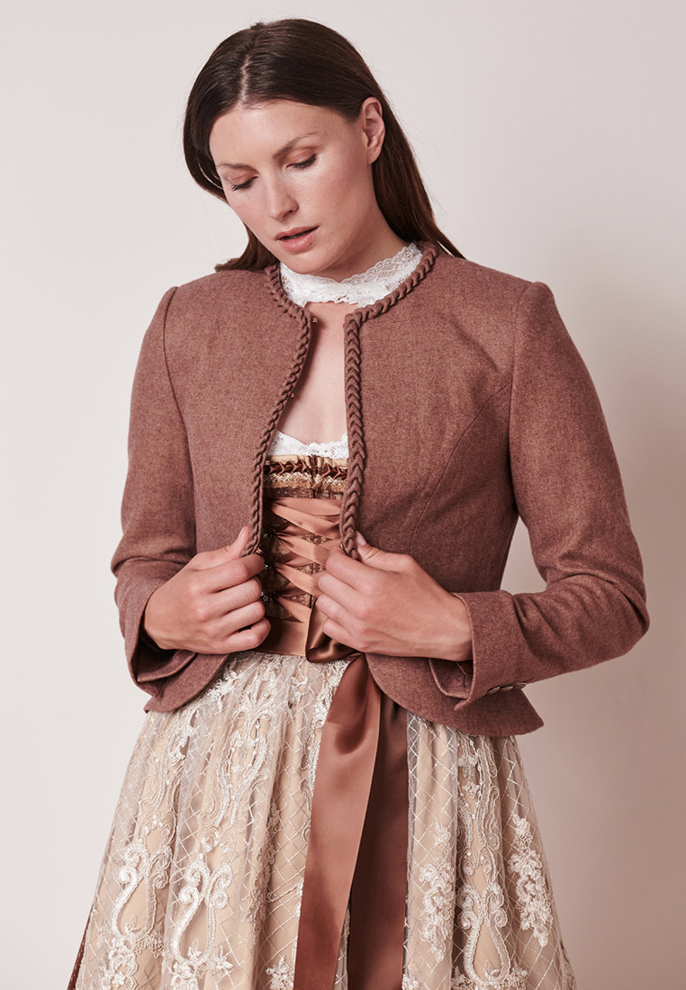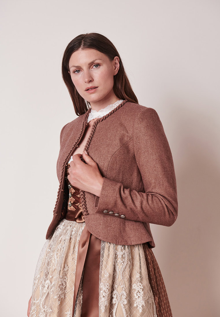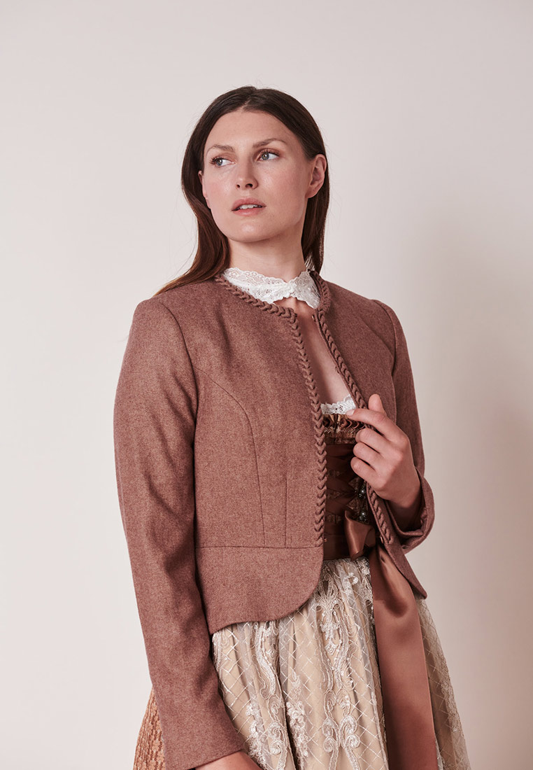 Liebliche Trachtenjacke in Braun. Die Trachtenjacke Allegra bezaubert sofort durch ein schlichtes aber dennoch stylisches Design. Tolle Borten entlang des Kragen sorgen für einen Eye Catcher.