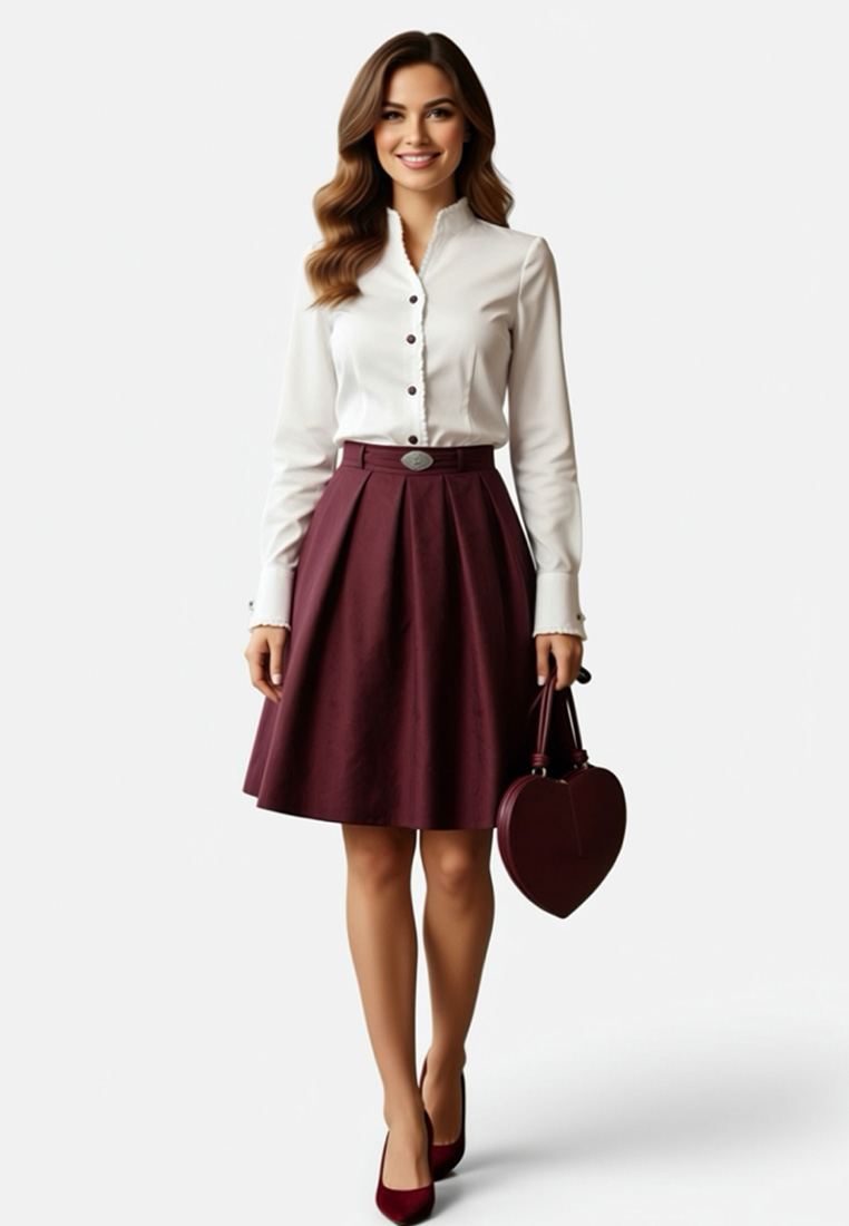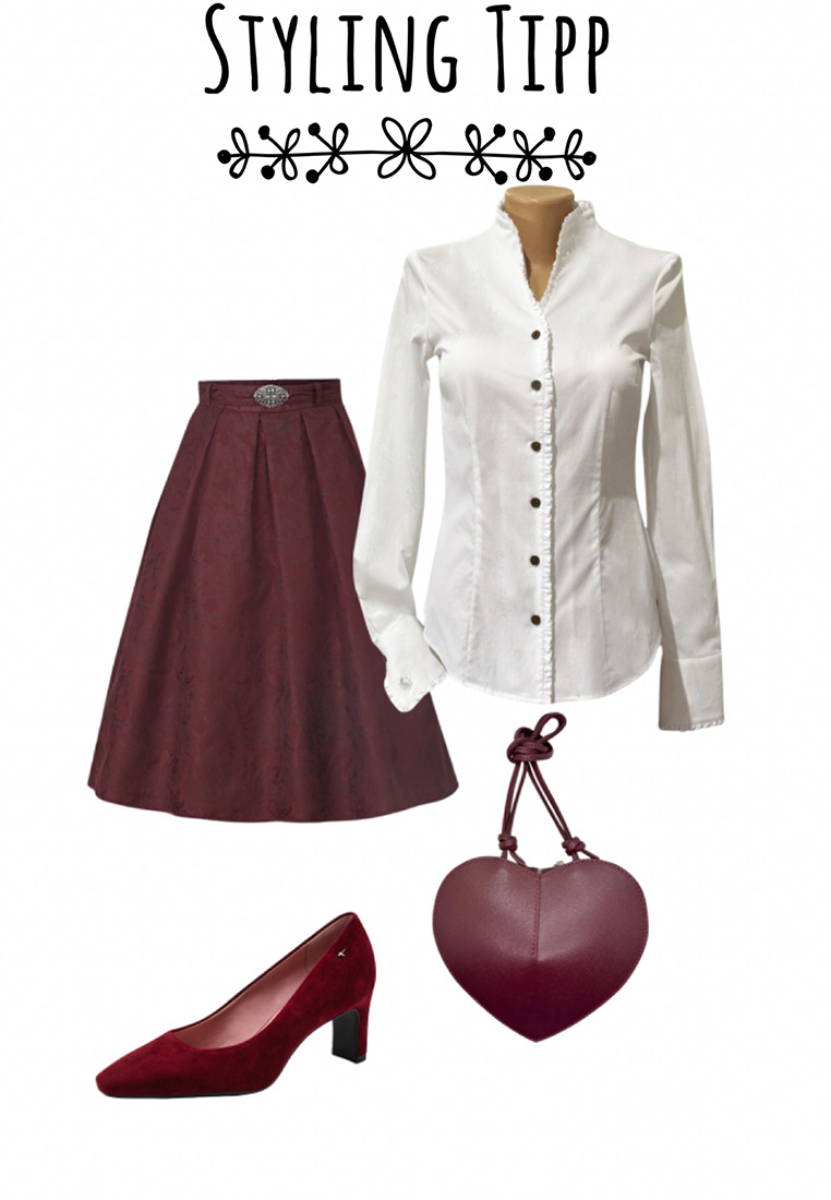 Der Trachtenrock Marquartstein der Marke Marjo ist ein stilvoller, traditioneller Rock in der Farbe Bordeaux. Mit einer Rocklänge von 70 cm ist er eine ideale Wahl, nicht nur fürs Oktoberfest sondern auch für festliche Anlässe und kombiniert Tradition mit modernem Stil. Die feminine und elegante Silhouette wird durch ein passendes Oberteil hervorgehoben. Besonders empfehlen wir die Kombination mit einem Spitzenbody, einer luftigen Trachtenbluse oder einem Trachtenjanker. Diese Outfitvariationen betonen nicht nur die Figur, sondern verleihen ein besonders stilvolles und harmonisches Erscheinungsbild. Perfekt für Trachtenliebhaber, die Wert auf Eleganz und Tradition legen!