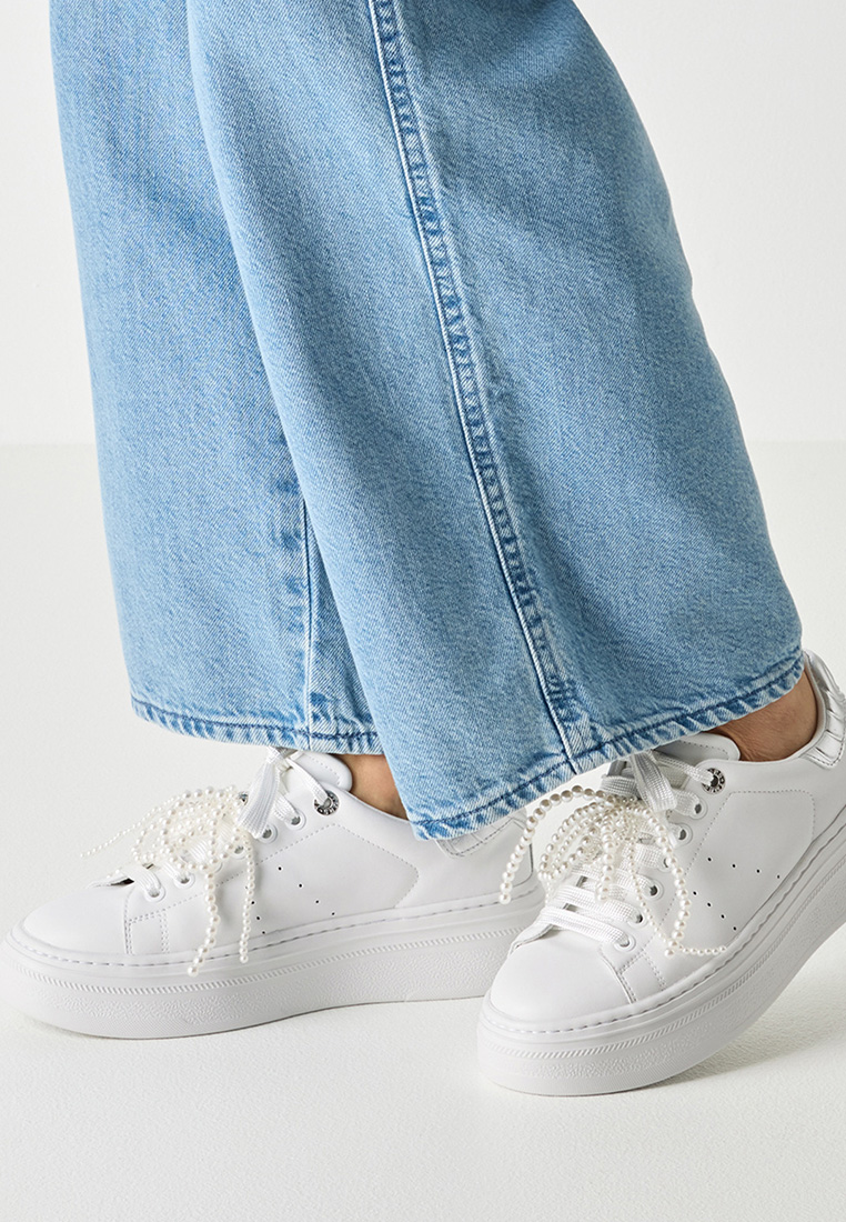 Klassischer weisser Sneaker aus echtem Leder mit leicht erhöhter Sohle und weisser Schnürung. Dieser Sneaker passt auch zur sportlichen Variante zum Dirndl. Sohlenhöhe 4cm.