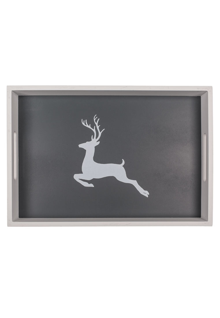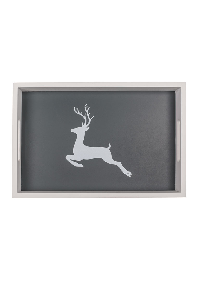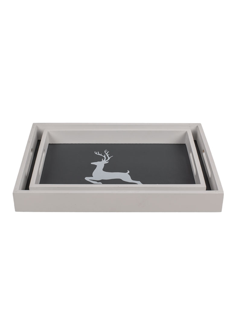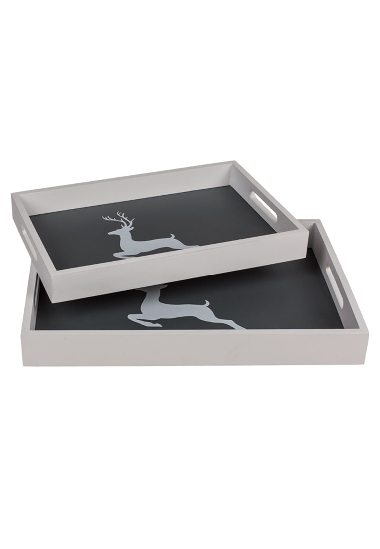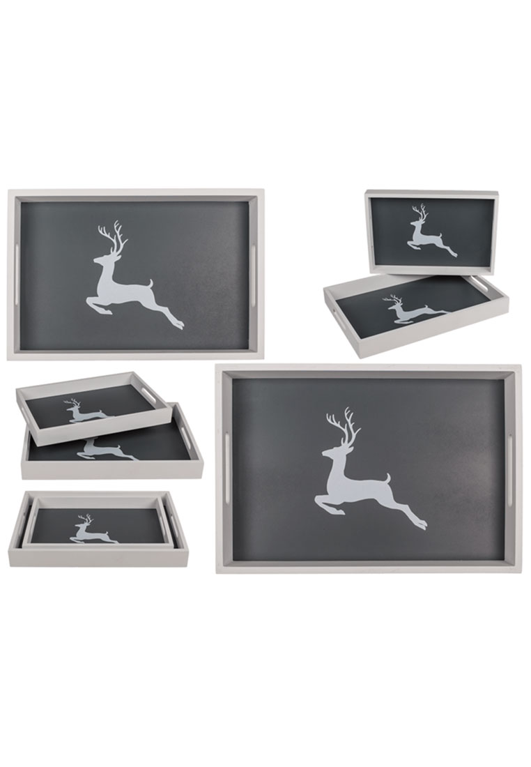 Verleihen Sie Ihrem Zuhause mit unserem Weiss-Grauen Holz-Tablett-Set mit Hirschmotiv einen Hauch von Eleganz und rustikalem Charme. Diese praktischen und gleichzeitig dekorativen Tablett-Sets eignen sich perfekt für die Präsentation und Organisation Ihrer Lieblingsstücke, während sie gleichzeitig einen Hauch von Naturinspiration in Ihre Räume bringen. Farbe: Weisses Tablett mit grauem Untergrund. Motiv: Weisser springender Hirsch. Dieses Set umfasst zwei vielseitige Tabletts, eines in der Grösse 35 x 24 cm und das andere in der Grösse 30 x 20 cm. Die Kombination aus weissem Holz und einem dezenten grauen Hintergrund verleiht diesen Tabletts eine zeitlose und vielseitige Ästhetik, die in nahezu jede Inneneinrichtung passt. Das Hirschmotiv auf jedem Tablett ist ein wunderschöner Akzent, der die Anmut der Natur in Ihr Zuhause bringt. Der springende Hirsch in Weiss hebt sich harmonisch von dem grauen Hintergrund ab und verleiht den Tabletts eine subtile Wildnisnote. Dieses Design verleiht Ihrem Interieur einen Hauch von ländlichem Flair und Eleganz. Die Tabletts sind nicht nur stilvoll, sondern auch praktisch. Verwenden Sie sie, um Snacks, Getränke, Kerzen, Blumenarrangements, Zeitschriften oder andere Gegenstände stilvoll zu präsentieren. Das Set eignet sich auch hervorragend als Geschenk für Freunde und Familie, die Freude an dekorativen Elementen und funktionalen Akzenten in ihrem Zuhause haben. Dieses Weiss/Graue Holz-Tablett-Set mit Hirschmotiv vereint Schönheit und Nützlichkeit und wird sicherlich einen besonderen Platz in Ihrem Zuhause finden. Bringen Sie die Naturschönheit in Ihre Räume und erleben Sie die Vielseitigkeit dieser dekorativen Tabletts in Ihrem Alltag.