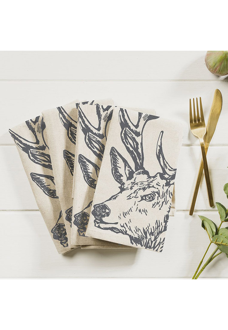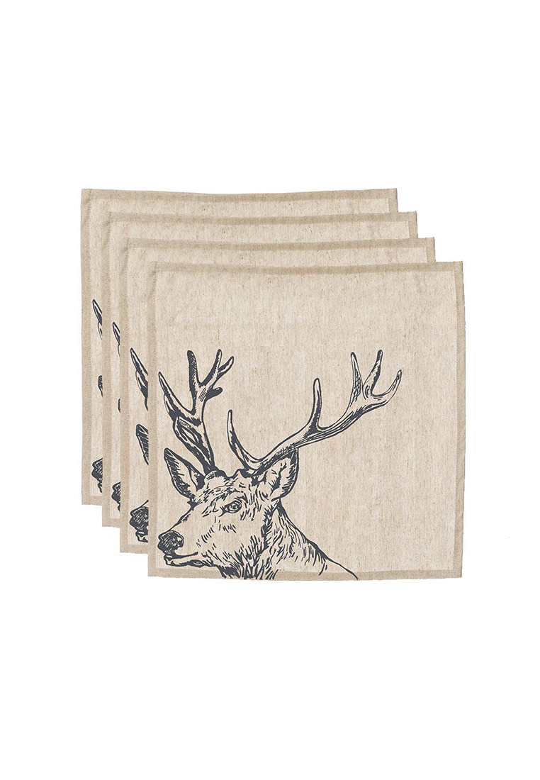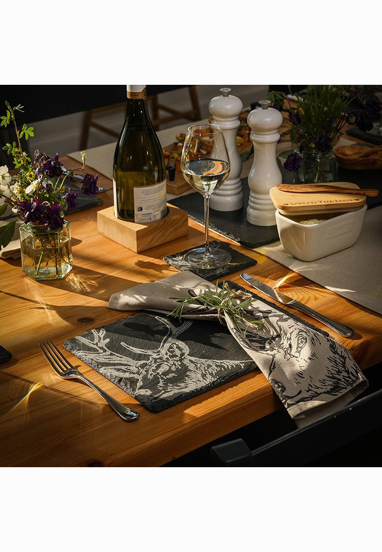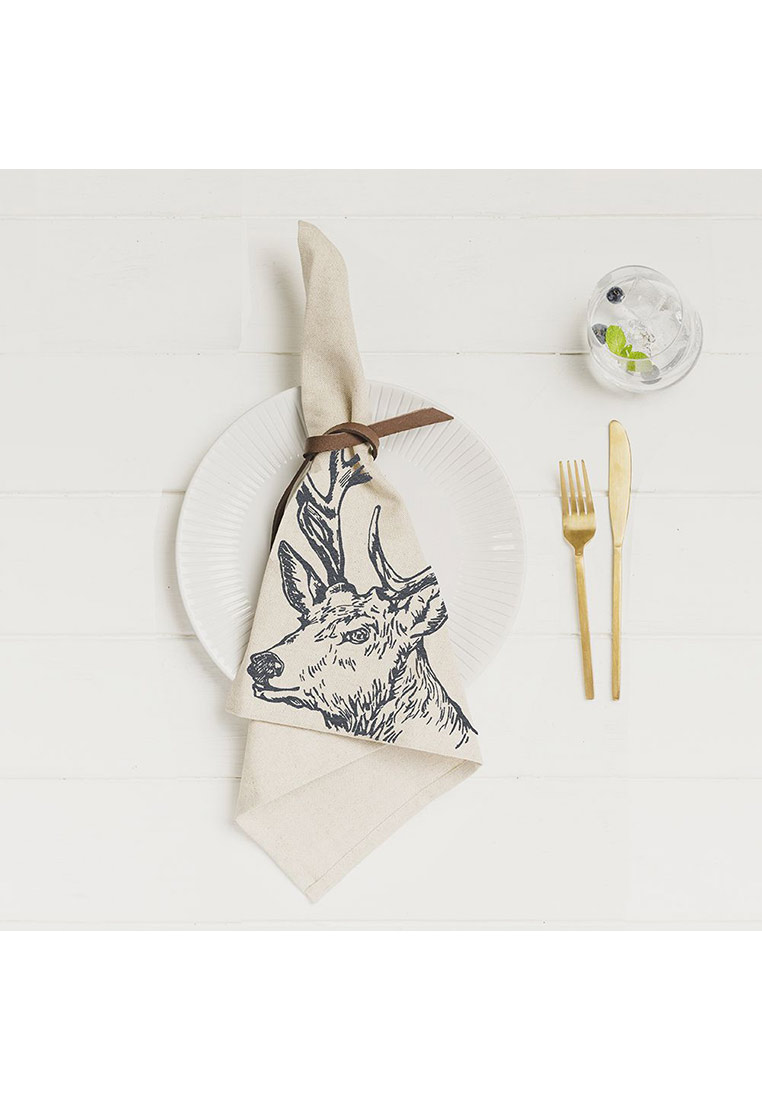 4 einzigartige Servietten aus Leinen-Baumwoll-Mischung, die jeweils mit einem einzigartigen Hirschaufdruck geschmückt sind. Diese unverwechselbaren Servietten werden Ihren Tisch schmücken. Das natürliche Finish dieser Servietten bietet einen minimalistischen Look, der Ihrem Tisch eine einfache Raffinesse verleiht. Die perfekten Lieblingsstücke für Abendessen oder Getränke. Gewebt in Schottland mit traditionellen Techniken in der letzten verbliebenen Leinenmühlen.