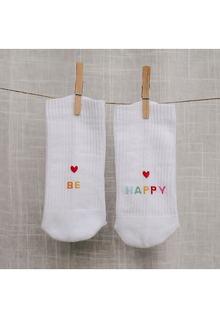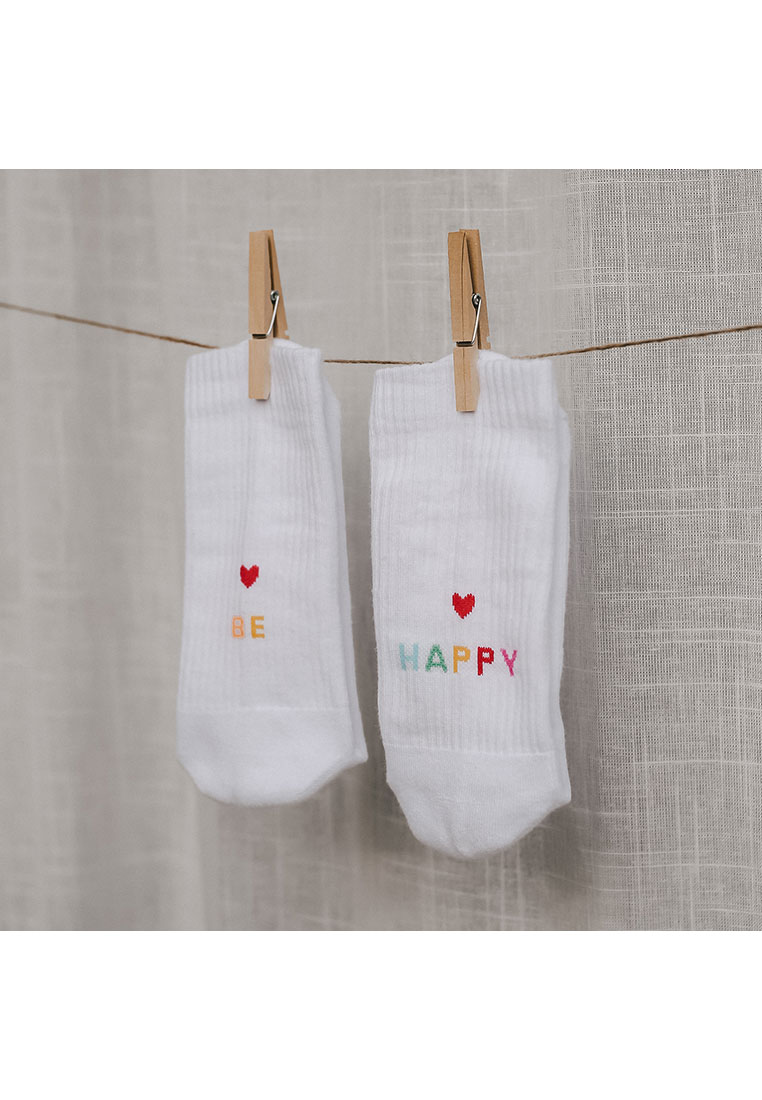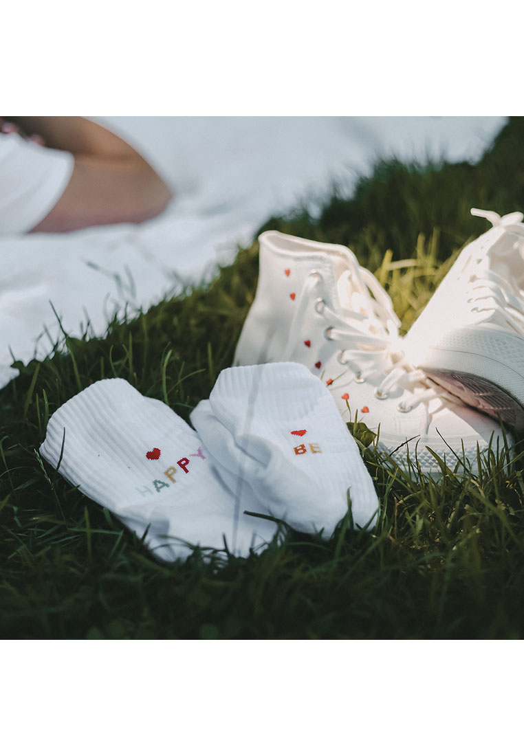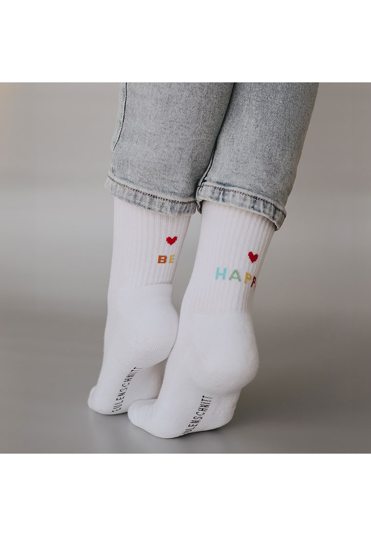 Farbenfroh und schlicht zugleich - unsere Socken be happy. Diese Socken zaubern jedem ein Lächeln ins Gesicht! Der Spruch „be happy“ schmückt in bunten Regenbogenfarben deine Fersen und schaut über deinem Sneaker hervor und bringt so dir und deinen Mitmenschen einfach gute Laune im Alltag. Perfekt für jeden Tag und passend zu jedem Outfit. Unsere Socken haben eine moderne, perfekte Höhe mit einem wunderbaren Design am Bund. Der Fersen- und Zehenbereich ist jeweils verstärkt und bietet somit besten und gemütlichen Tragekomfort. Ein tolles Geburtatagsgeschenk oder Mitbringsel an Wheinachten. Die Socken sind aus 80% GOTS zertifizierter Bio-Baumwolle, 18% recyceltes Polyester und 2% Elastan in der Türkei gefertigt.