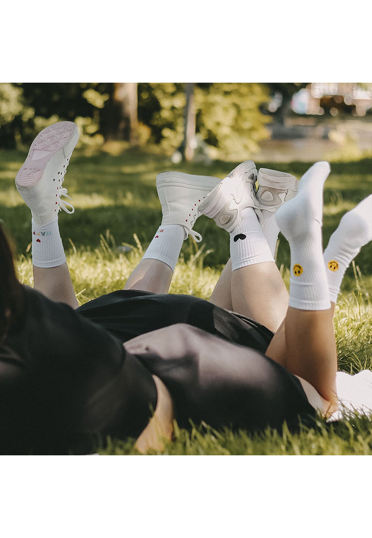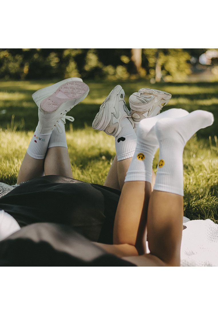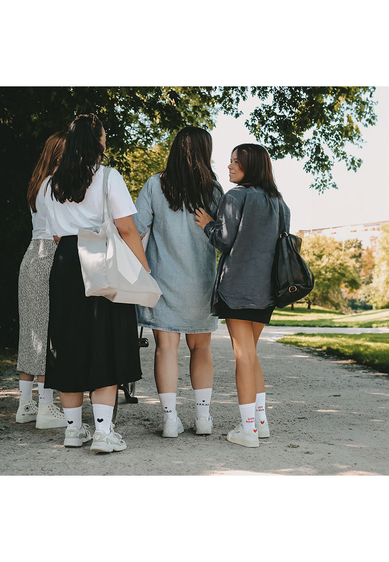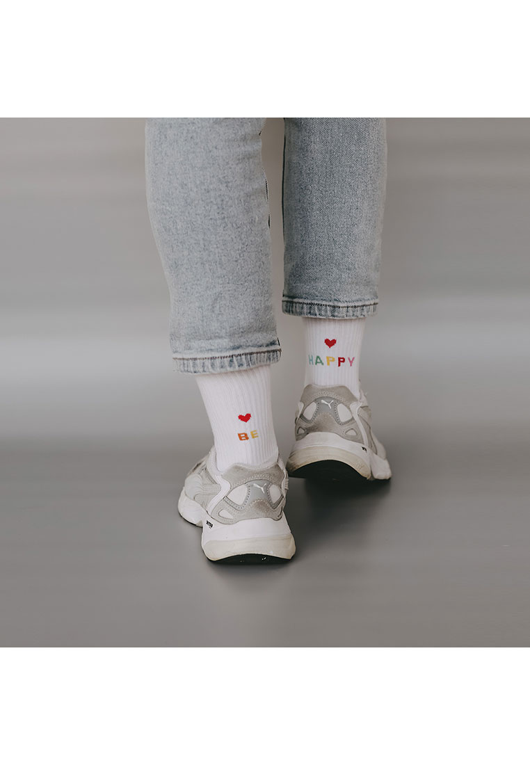Farbenfroh und schlicht zugleich - unsere Socken be happy. Diese Socken zaubern jedem ein Lächeln ins Gesicht! Der Spruch „be happy“ schmückt in bunten Regenbogenfarben deine Fersen und schaut über deinem Sneaker hervor und bringt so dir und deinen Mitmenschen einfach gute Laune im Alltag. Perfekt für jeden Tag und passend zu jedem Outfit. Unsere Socken haben eine moderne, perfekte Höhe mit einem wunderbaren Design am Bund. Der Fersen- und Zehenbereich ist jeweils verstärkt und bietet somit besten und gemütlichen Tragekomfort. Ein tolles Geburtatagsgeschenk oder Mitbringsel an Wheinachten. Die Socken sind aus 80% GOTS zertifizierter Bio-Baumwolle, 18% recyceltes Polyester und 2% Elastan in der Türkei gefertigt.