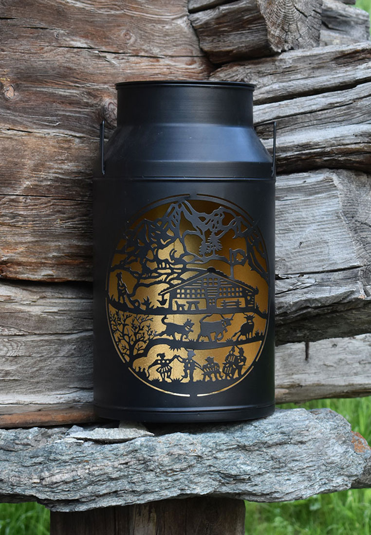 Modernität kombiniert mit Schweizer Tradition war das Ziel dieser Kollektion. Entstanden ist die «ligne noire» mit dem Sujet Chalet und einer speziellen schwarzen Mattlack-Beschichtung, welcher der traditionellen Milchkanne eine noch nie dagewesene Modernität und Eleganz verleiht. Die «Ligne Noire» lässt sich sowohl mit Holz, Stein oder auch fantastisch mit Sichtbeton kombinieren. Das Gewicht der Milchkanne ist 8.780kg und die Masse sind 16x28cm. Das Material ist aus Metall. Die Milchkanne kann Outdoor benützt werden. Diese Variante ist die mittlere Grösse auf dem angefügten Produktbild.