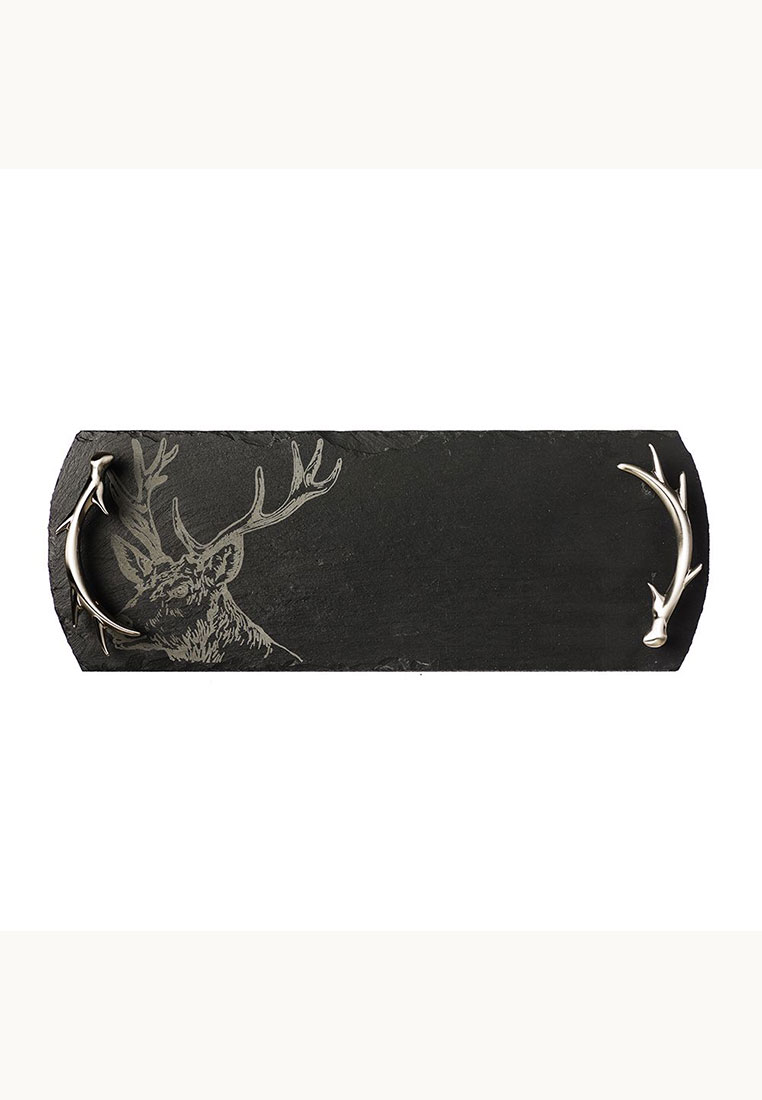 Präsentieren Sie Ihre Lieblings-Vorspeisen auf unserem stilvollen, gravierten Serviertablett mit Hirschmotiv und auffälligen Griffen in Geweihform aus Edelstahl. Das Tablett wird in Schottland aus hochwertigem Schiefer handgefertigt. Es ist nicht nur äusserst langlebig, sondern besticht auch durch seine vielseitige Funktionalität und natürliche, zeitgemässe Eleganz. Perfekt geeignet, um eine Auswahl an Käse, Wurstwaren und Crackern, Ihre Lieblings-Canapés oder kleine Snacks stilvoll zu servieren. Unser Schieferserviertablett ist mit einer handgezeichneten Illustration eines majestätischen Hirsches graviert, die dem Design einen zusätzlichen Hauch von Stil und Charme verleiht. Masse: 42 cm (L) x 15 cm (B)