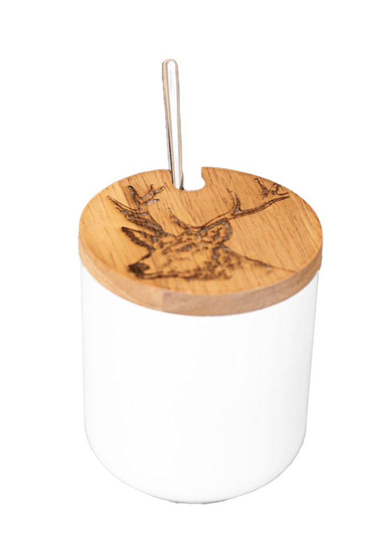 Hübsche Zuckerdose mit Holzdeckel und eingraviertem Hirsch. Dazu kommt auch ein passender Löffel. Eine gute Geschenkidee für deine Freunde welche ein Chalet oder eine Ferienwohnung in den Bergen besitzen oder sonstige Hirsch-Fans.