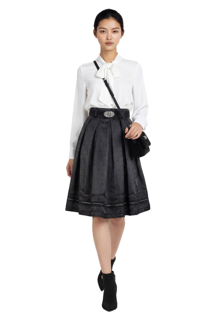 Der Trachtenrock Eleana von Marjo ist ein wunderschönes Kleidungsstück, das sich perfekt für traditionelle Anlässe wie Hochzeiten, Bergfeste, Oktoberfeste, Volksfeste oder Schlagerpartys eignet. Dieser Rock ist in einem eleganten Schwarz gehalten. Das Design des Rocks ist geprägt von einem floralen Muster, das ihm eine romantische und traditionelle Note verleiht. Ein besonderer Blickfang dieses Trachtenrocks ist der elastische Gürtel mit schwarzen bestickten Perlen. Dieser Gürtel betont die Taille und verleiht dem Rock eine zusätzliche elegante Note. Der Rock verfügt über einen hübschen Abschluss, der ihm eine raffinierte und feminine Silhouette verleiht. Er ist perfekt geschnitten, um sowohl traditionelle als auch moderne Looks zu kreieren. Ein passendes Oberteil welches hervorragend zum Trachtenrock harmoniert findest du bestimmt auch in unserem Shop, um das perfekte Trachtenoutfit zu vervollständigen. Dieses Outfit wird sicherlich bewundernde Blicke auf traditionellen Veranstaltungen und Festen auf sich ziehen.