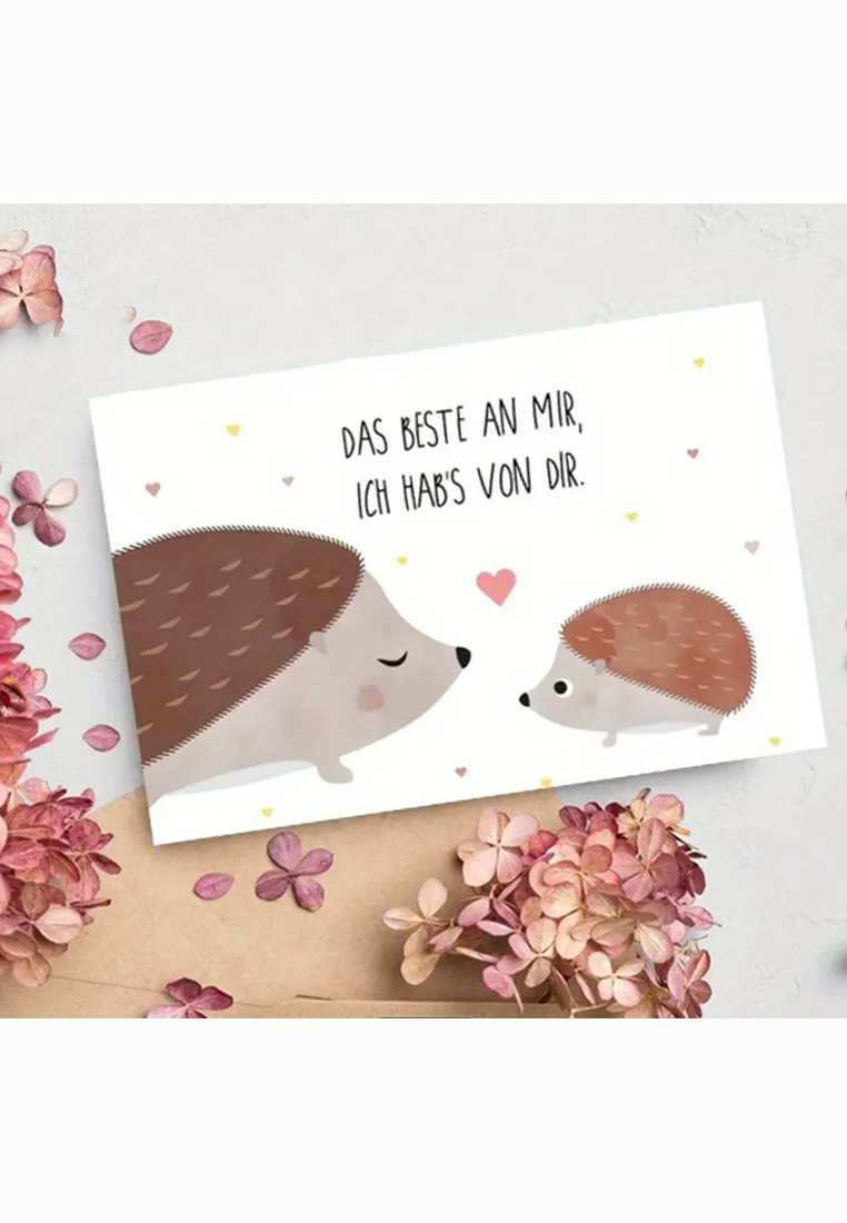 Diese liebevoll gestaltete Grußkarte ist eine wunderschöne Art, Wertschätzung und Dankbarkeit auszudrücken. Mit dem süßen Motiv eines großen und kleinen Igels sowie dem herzerwärmenden Spruch „Das Beste an mir, ich hab’s von dir“ ist sie perfekt für besondere Anlässe wie Muttertag, Geburtstag oder einfach als liebe Geste zwischendurch. Die sanften Farben und die verspielten Herzchen verleihen der Karte einen charmanten und warmen Look. Gefertigt aus hochwertigem Papier, bietet sie ausreichend Platz für eine persönliche Nachricht auf der Rückseite. Eine ideale Möglichkeit, einem geliebten Menschen ein Lächeln ins Gesicht zu zaubern und die tiefe Verbundenheit auf eine kreative Weise zu zeigen. Inklusive Couvert. Masse: 18cmx12cm.
